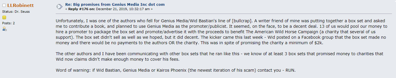 bastian Beware: Wid Bastian a.k.a. Widtsoe T. Bastian / Genius Media Inc. / Kairos Phoenix Company By feedproxy.google.com Published On :: Tue, 31 Dec 2019 00:14:00 +0000 Posted by Victoria Strauss for Writer Beware®Scroll down for updatesEarly in 2019, seventeen writers were recruited to participate in a box set of medical thrillers, called (with unforeseen irony) Do No Harm.The buy-in: $750, with net income from sales going to two designated charities, and participating writers receiving a pro-rated share of any net income above those contributions. The goal: through cooperative marketing efforts, to get the set on the USA Today bestseller list.Here's how the opportunity was presented to potential participants (this is from an email that was shared with me):In other words, right off the bat, authors were being primed not to expect to make money.Helming the endeavor was a five-year-old PR company called Genius Media Inc., owned by a man called Wid Bastian (full name: Widtsoe T. Bastian). Per this long 2017 discussion on KBoards, one of Genius Media's not-so-genius MOs was to cold-contact writers by form email and offer glowingly-described Kindle Unlimited promotions. "For you, my estimate on an eBook promo is 10,000 plus downloads and 700 plus sales, positive ROI right out of the gate and huge page read income."The cost: $2,000.KBoards members urged caution, especially after expert analysis of Genius's claims indicated that its promotions weren't as successful as it advertised, and information offered by a writer who'd paid for a promo suggested that Genius was violating the TOS of the advertising platforms it used. Also noteworthy: this post from a writer who bought two promos from Genius, and lost money on each one. "That is what Genius Media told me to expect, that the first promo would not show a profit, but that by the second or third promo, they would show a profit." (The writer bought a third promo.)As it turns out, these concerns were a sign of things to come.Do No Harm was published, as promised, and made the USA Today bestseller list, also as promised. On October 3 (or possibly October 4), it was unpublished--three (or possibly four) days after the contractually-stipulated end date of September 30.Per the contract (which you can see here), final reporting and payment was due to authors "no later than December 1". December 1 came...and went. Bastian promised anxious authors they'd get everything by December 15.One day past that deadline, they did receive a report...but not from Genius Media. Between early December and December 16, with no notice or warning, a company called Kairos Phoenix had purportedly acquired Genius. Other than its business registration--in Wyoming, just like Genius's--and hometown--Logan, Utah, again just like Genius's--Kairos was a black box, with zero web presence. It had incorporated less than a month earlier, on November 22. (You can see the report here.)That wasn't all that was suspicious. Here's Kairos's financial breakdown:In other words, USA Today bestselling box set Do No Harm hadn't just failed to make a profit, it had lost money. But...where was the revenue from the $750 buy-in fees--which, with 17 authors, totaled $12,750? (Kairos's explanation: it wasn't included because it was "ordinary income" for Genius Media. "As stated in the contract, the fee was paid to 'participate' in DNH Collab by the author and for no other purpose".) Where were revenues for the days the set had been on sale past the unpublish deadline? (Kairos: "The contractual period for DNH Collab was strictly defined in the contract" as September 30, so any revenue past that date was "irrelevant".)Equally troubling, why were there more than $15,000 in expenses--three-quarters of which were for "labor"--when the contract stipulated that expenses were not to exceed the total of the buy-in fees? According to Kairos, this wasn't really an expense cap: "This provision was specifically and intentionally included in the contract language to avoid the possibility of a 'cash call' – Genius Media asking authors to contribute more to DNH Collab to achieve the goal of making USA Today Bestseller status. No 'cash call' was ever made in the DNH Collab."Here's the actual contract wording, though (my bolding):For the purposes of the USA Today Bestseller Medical Thriller Author Publishing Collaborative Boxed Set program, Genius Media shall not incur any publication and promotion expenses of any nature in excess of the fees paid under the terms of its author agreements and shall have no power to obligate [redacted] or any other author for any publication and promotion expense above author fees paid whatsoever.There's a "cash call" prohibition and an expense cap. But Kairos wanted writers to believe otherwise, so it could inflate expenses and ensure a loss.It was obvious to Do No Harm participants that Kairos was taking the money and running--avoiding the substantial payouts it would otherwise have to make by retroactively interpreting contract language, and also enabling Bastian himself to claim he was blameless because of Genius's supposed takeover by an unrelated company. (No one was under any illusion that Kairos Phoenix was anything other than Bastian in a different guise.)Authors were furious. On December 22, two of them, Christoph Fischer and Dan Alatorre, went public with their experience. Others posted warnings on Kairos's corporate business listing. Do No Harm isn't the first time Bastian has run this scheme, either.The box set in question appears to be Tales From Big Country, which was published around the same time as Do No Harm. A third set, Galaxia, was pubbed in September, with profits supposedly going to the Well Aware clean water charity. I've been told that Bastian is recruiting for other sets, including a collection of thrillers.So who is Wid Bastian, a.k.a. Widtsoe T. Bastian?His LinkedIn profile ("EXPOSE your new book to develop your author brand and sell more books!") iden