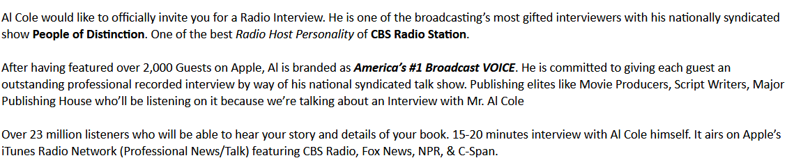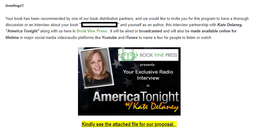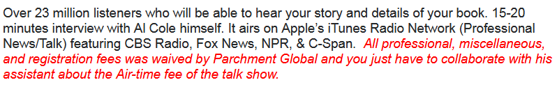 vanity Vanity Radio: Why You Should Think Twice Before Paying For an Interview By feedproxy.google.com Published On :: Wed, 11 Dec 2019 17:52:00 +0000 Posted by Victoria Strauss for Writer Beware® In a super-crowded, hyper-competitive marketplace, one of the main challenges for book authors is to stand out. And where there's a need, there are always unscrupulous operators waiting to take advantage. The internet is awash in worthless schemes and outright scams designed to profit from authors' hunger for publicity and exposure.I've written about a number of these--Hollywood book-to-screen packages, the hugely marked-up PR options offered by Author Solutions, the plague of marketing scams originating in the Philippines. Others to watch out for include book fair display packages (publishing industry expert Jane Friedman has a good article on why these are not worth your money), pay-to-play book review services, and what I'm going to talk about in this post: vanity radio.What's vanity radio? In the "writer beware" context, it's radio air time that you, the program guest, have to pay for. Such schemes have been around forever in various forms, aimed at experts and creatives of all kinds, from services that explicitly sell pay-to-play interviews, to show hosts that charge interview fees to defray the fees they themselves have to pay their platforms.The main selling point is the promise that your interview will be heard by a large and eager audience, giving wide exposure to you and your book (see the pitches that I've pasted in below). But vanity radio is primarily online radio, delivered via platforms like Blog Talk Radio and Spreaker, and streaming services like iTunes, iHeart Radio, and SoundCloud. Online radio listenership is steadily rising, but unless there are subscriber lists (as on YouTube, for instance), there's usually no way to determine the audience for any given host or show--or to authenticate any listenership claims the show may make. Lots of people may be tuning in...or no one at all.As a result, the only verifiable benefit authors may receive for their money is an audio or audio-and-video clip that they can post to their websites and social media accounts. Whether that's worth it when it costs $99 or $150 or $200 is debatable enough. But when the price tag is four figures?As always in the realm of junk marketing aimed at writers, Author Solutions has been both the pioneer and the primary practitioner. All its imprints sell vanity radio in some form: here's AuthorHouse's offering, for instance (just $1,099!). iUniverse's is identical. Xlibris and Trafford currently sell teasers rather than interviews (for significantly more money), but through 2017 they too hawked interviews.Recently, however, AS's leadership in the realm of predatory marketing services has been challenged by a flood of scammy imitators. These copycat ripoff factories have adopted vanity radio in a big way, and they aggressively hawk it to authors, both on its own and as part of costly publishing and marketing packages. Here, for instance, is an offer from Book Vine Press (cost: $1,500):From Author Reputation Press (cost: £1,500):From Parchment Global Publishing (cost: $1,499):The copycats re-sell the services of a number of show hosts (there's a list below), but the three personalities noted above--Kate Delaney with America Tonight Radio, Ric Bratton with This Week in America, and Al Cole with People of Distinction--make the most frequent appearances on the copycats' websites and in their email solicitations. Delaney and Bratton have substantial, legit resumes in TV and radio; Cole is a bit harder to research, but he too seems to have a sizeable track record as a talk show host.What, if anything, do they know of the reputation and tactics of the copycats that are re-selling their services? I contacted all three for comment last week. Cole's assistant responded in email that "Al Cole knew nothing about this....Our office will certainly look into this." As of this writing, I haven't heard back from Delaney or Bratton.Given that the copycats routinely charge an enormous markup on products they re-sell (see, for instance, this warning from the Combined Book Exhibit, whose book fair exhibit packages many of the copycats re-sell for hugely inflated prices; the copycats also seriously jack up the fees for paid book reviews such as Kirkus Indie and BlueInk Reviews), it seems a fair bet that the interviews' hefty price tags are substantially inflated as well.Apart from the question of such interviews' value for book promotion, that seems like reason enough to avoid them.******Author Solutions copycats that sell interviews from the individuals mentioned above:BookVenture, ReadersMagnet, Maple Leaf Publishing, Parchment Global Publishing, Rustic Haws, Branding Nemo, Creative Titles Media, Paradigm Print, Stampa Global, Books Scribe, Matchstick Literary, PageTurner Press, EC Publishing, WestPoint Print and Media: Ric BrattonLitFire Publishing, Author Reputation Press, ReadersMagnet, BookTrail Agency, Book-Art Press, Box Office Media Creatives, IdeoPage Press, Book Agency Plus: Kate DelaneyReadersMagnet, Author Reputation Press, Rustik Haws, URLink Print & Media, Workbook Press, Parchment Global Publishing, BookWhip: Al ColeBookTrail Agency: David SereroBookTrail Agency, Book Agency Plus: Angela ChesterUPDATE 1/9/19: Parchment Global has added the disclaimer in red to its solicitations for Al Cole interviews (it might want to do some proofreading):I don't know if this was at Mr. Cole's behest (remember, he's the only vanity radio host who responded--if not very expansively--to my request for comment) or is just CYA by Parchment Global itself, but hey--it lets me know that the scammers are still reading my blog.Do I believe Parchment Global has stopped taking a cut? What do you think? Full Article