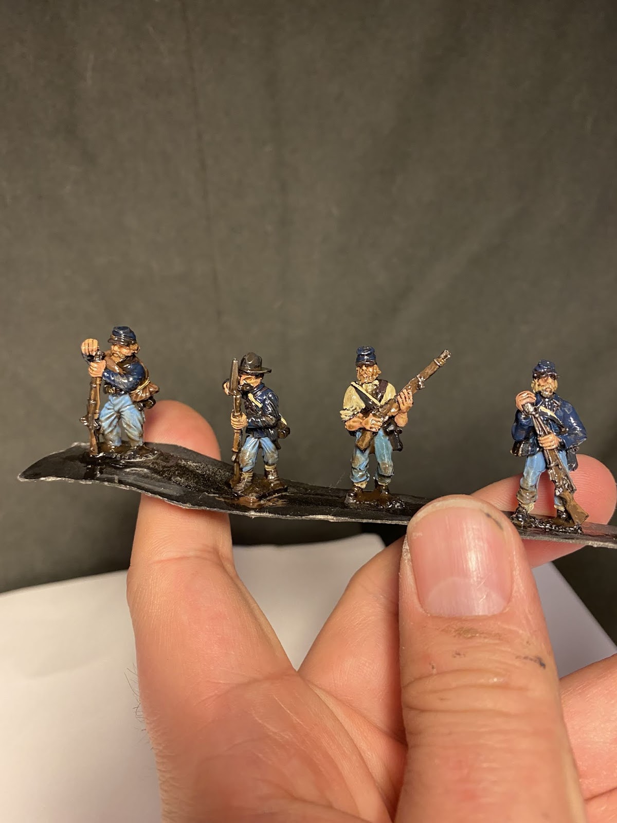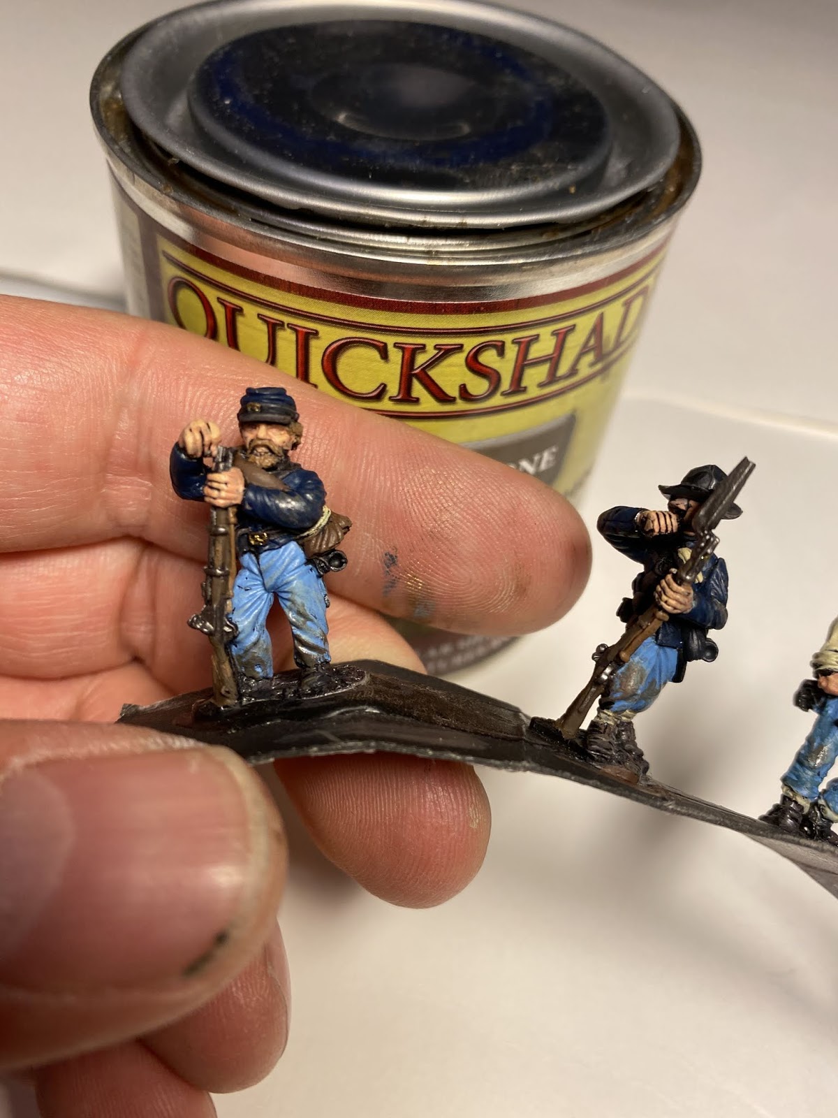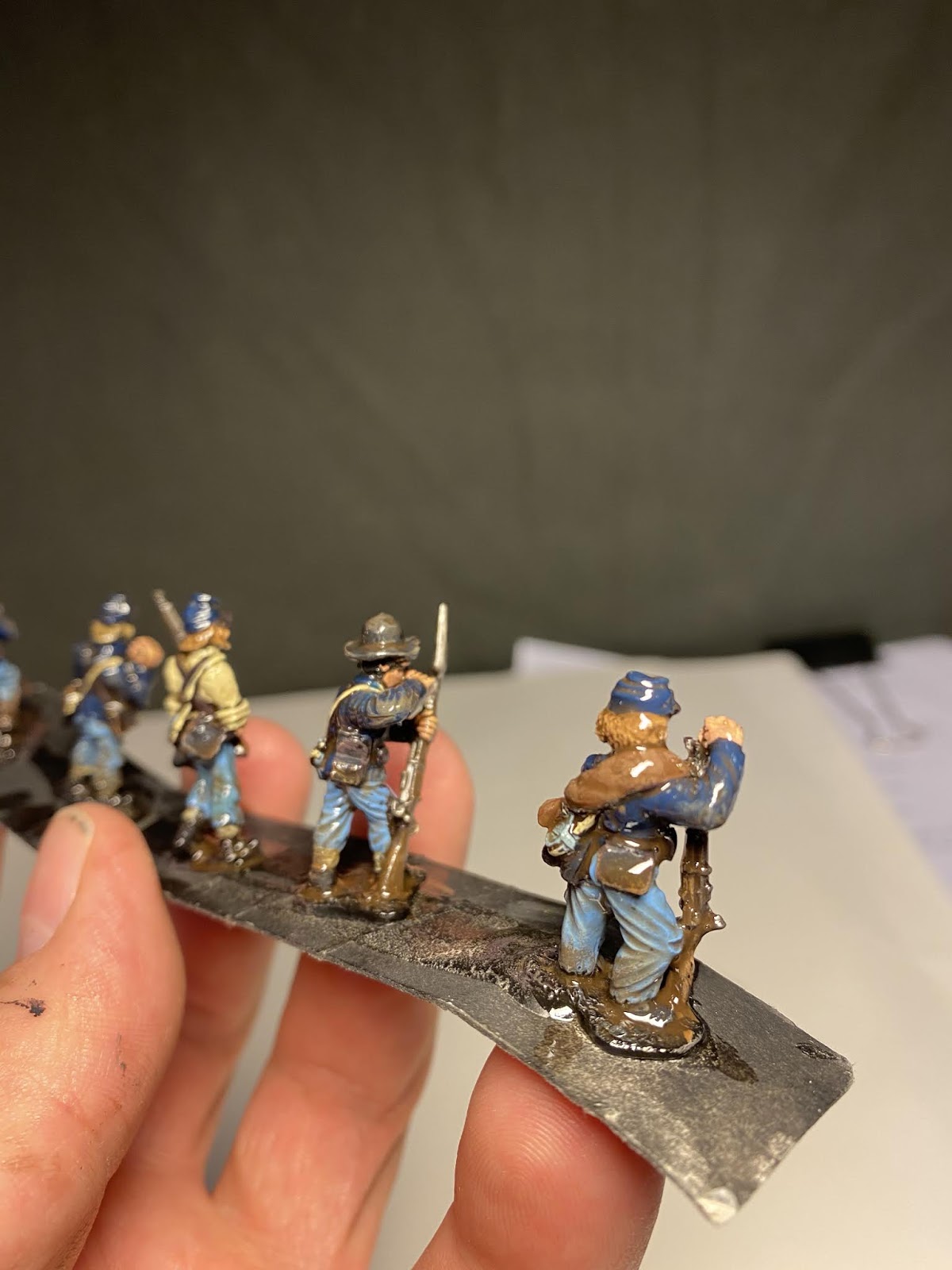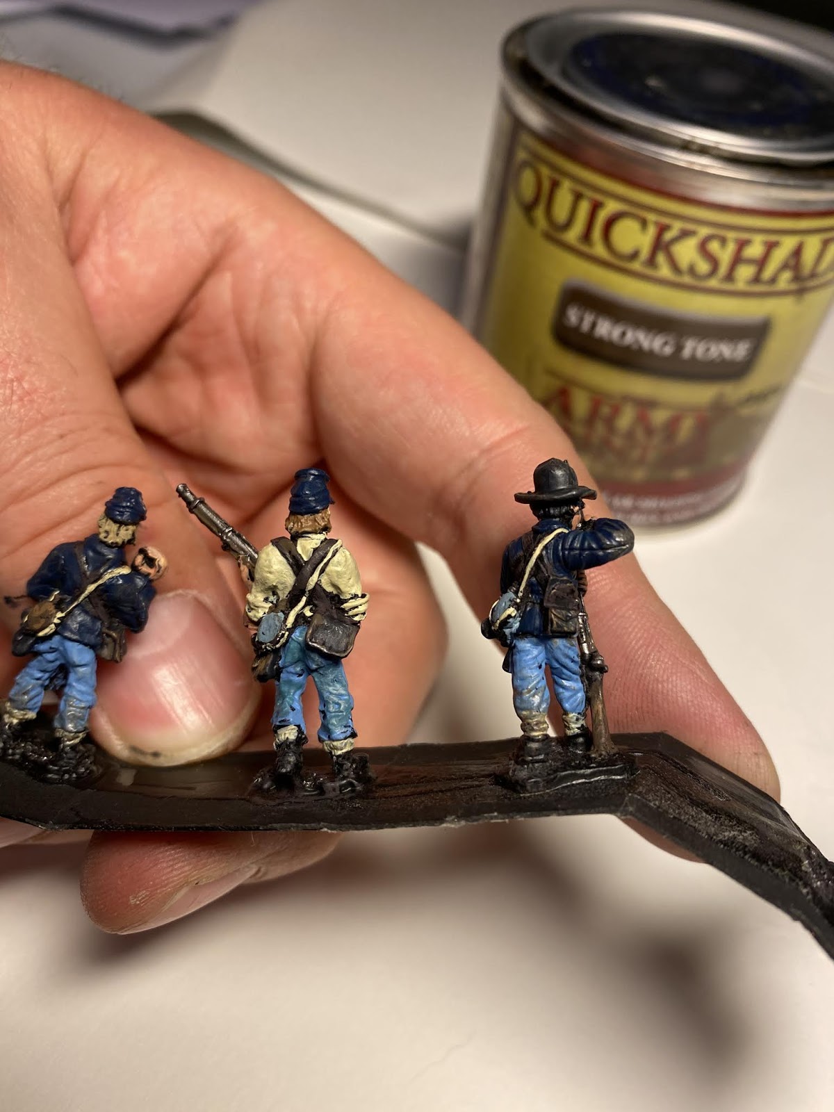 speed Speed paint challenge ACW By iron-mitten.blogspot.com Published On :: Sat, 11 Apr 2020 20:44:00 +0000 I gave myself a challenge tonight of seeing how quick I could paint some ACW soldiers to a standard I’d be happy to game with. I started off with a black under coat and added single colours to block out the uniform. I forced myself to just use one coat colour ( Foundry Union uniform B), I found later this can be dry-brushed with earth brown and this acts as a highlight. The soldiers are rough and ready campaign guys, so mud and dust was added to them.Also, I love the fact that the varnish is as hard as nails and will protect them from knocks and scrapes. My last lot, because of the number of them, I just matte varnished without any gloss or floor varnish underneath. This didn’t sit well with me and I’m a lot happier knowing this lot have been dipped. As with the ECW lot, the flesh is the only paint I allowed myself to use two colours on. It made such a difference it was a ‘no brainer’. Skin tone under Army Painter needs two colours I think, as sometimes without, it can loose something and the men appear a little lifeless. Well after the quick blocking in and weathering I gave them a brush with the Army Painter strong tone. The results were very pleasing, a lot better than the photos do justice really.For the American Civil War you need a lot of men unless of course you are using skirmishing rules. This I think has to be the route for me now with all of of my big projects, the results are quick and still pleasing. It’s also nice to force yourself into new ways of working which helps keep the hobby fresh and rewarding. I think that is a good word to use for the Dip, rewarding. Seeing those bags of figures in draws get a lick of paint on them and become units and thus, usable. We’ll have to see how they turn out when they’re matte varnishedThis lot must have taken me an hour maybe a bit less. The brown tone works well on these guys but should be even better on the soft greys and browns of the Confederate army. Full Article American Civil War Dip