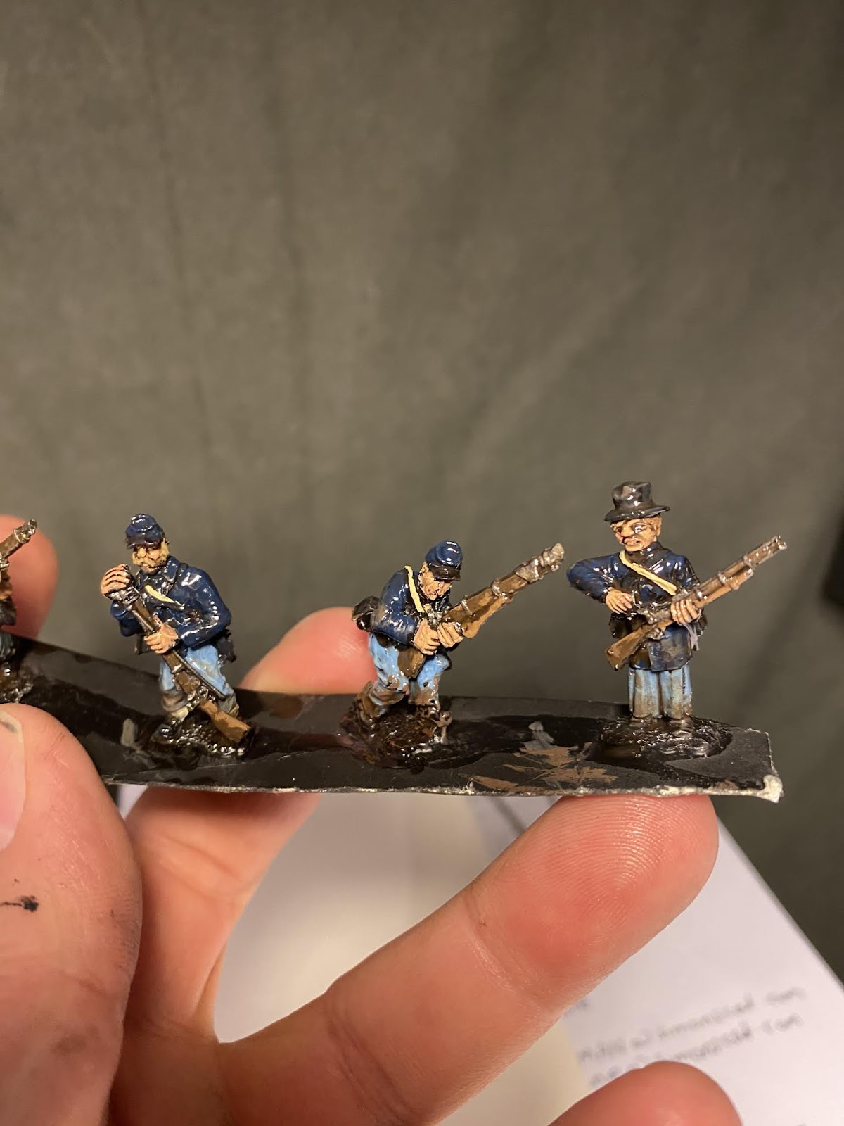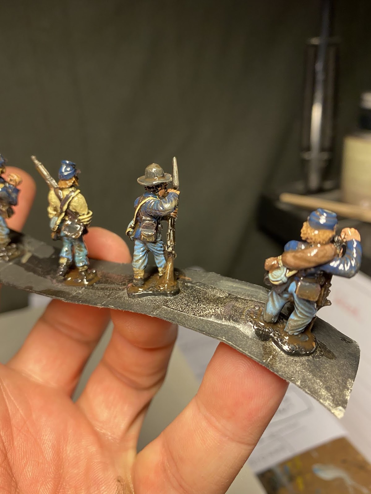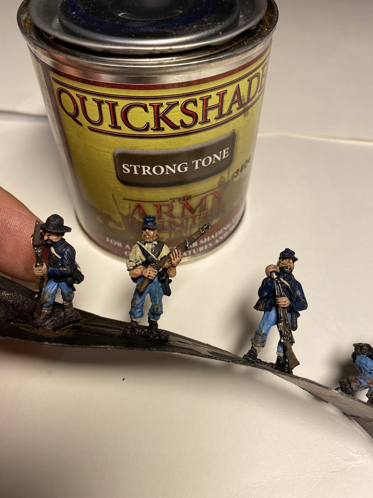 speed Speed paint challenge ACW By iron-mitten.blogspot.com Published On :: Sat, 11 Apr 2020 20:44:00 +0000 I gave myself a challenge tonight of seeing how quick I could paint some ACW soldiers to a standard I’d be happy to game with. I started off with a black under coat and added single colours to block out the uniform. I forced myself to just use one coat colour ( Foundry Union uniform B), I found later this can be dry-brushed with earth brown and this acts as a highlight. The soldiers are rough and ready campaign guys, so mud and dust was added to them.Also, I love the fact that the varnish is as hard as nails and will protect them from knocks and scrapes. My last lot, because of the number of them, I just matte varnished without any gloss or floor varnish underneath. This didn’t sit well with me and I’m a lot happier knowing this lot have been dipped. As with the ECW lot, the flesh is the only paint I allowed myself to use two colours on. It made such a difference it was a ‘no brainer’. Skin tone under Army Painter needs two colours I think, as sometimes without, it can loose something and the men appear a little lifeless. Well after the quick blocking in and weathering I gave them a brush with the Army Painter strong tone. The results were very pleasing, a lot better than the photos do justice really.For the American Civil War you need a lot of men unless of course you are using skirmishing rules. This I think has to be the route for me now with all of of my big projects, the results are quick and still pleasing. It’s also nice to force yourself into new ways of working which helps keep the hobby fresh and rewarding. I think that is a good word to use for the Dip, rewarding. Seeing those bags of figures in draws get a lick of paint on them and become units and thus, usable. We’ll have to see how they turn out when they’re matte varnishedThis lot must have taken me an hour maybe a bit less. The brown tone works well on these guys but should be even better on the soft greys and browns of the Confederate army. Full Article American Civil War Dip