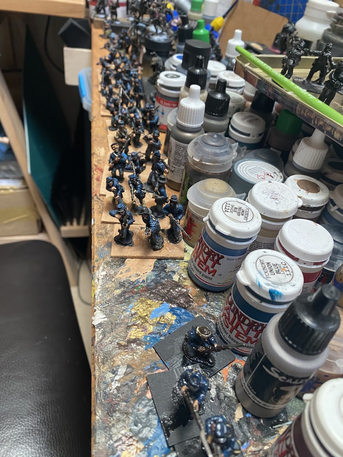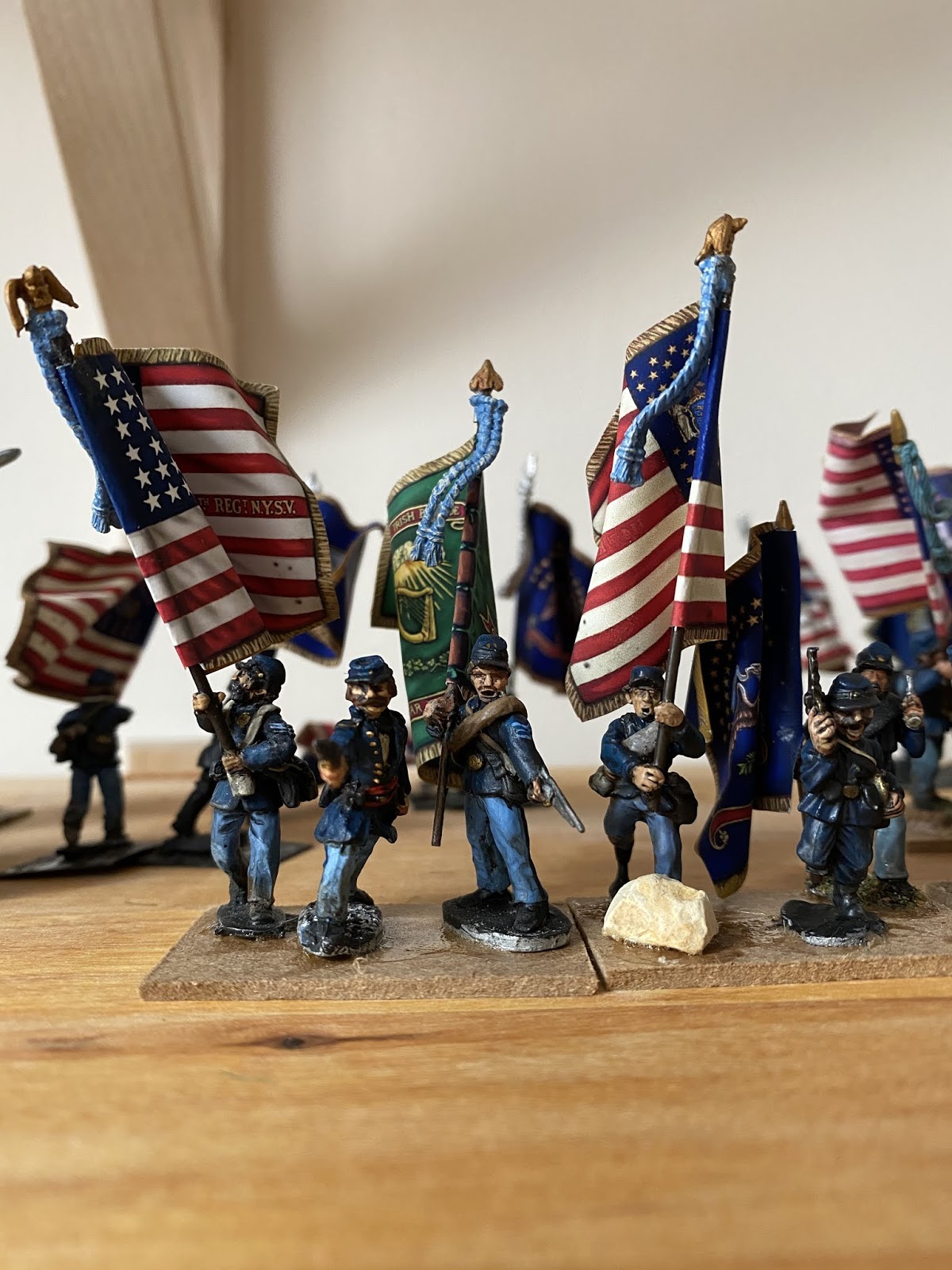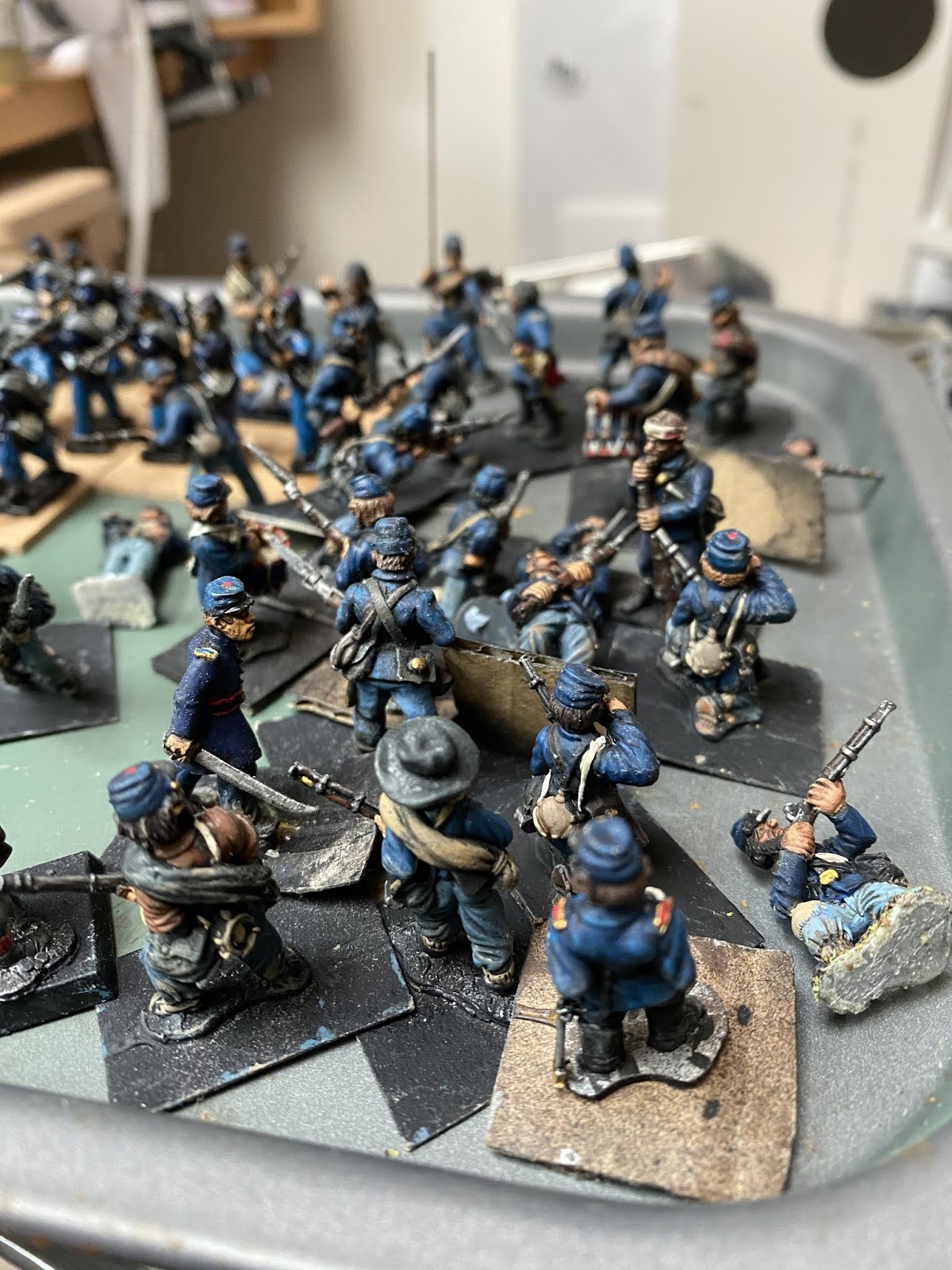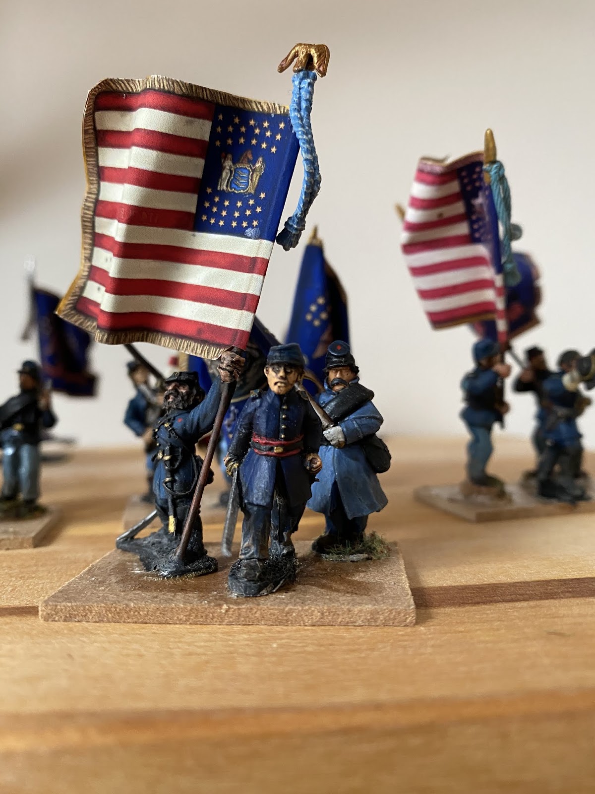 boy Hurrah boys Hurrah! By iron-mitten.blogspot.com Published On :: Mon, 20 Apr 2020 07:42:00 +0000 I thought I would give myself a lock down project to see if I could get some more Union troops done. The first batch were done some months ago and just left in a draw ( getting slightly damaged). This second lot, I just thought ‘too hell with it’ and decided to Dip them all in strong tone. This made them much more fun and quicker to paint, it also meant they were a lot more tougher than the first batch. The third batch were the original figures painted up around 1998, brought up to muster with a retouch of paint. Rather than paint individual regiments, I’m going for the Regimental Fire and Fury approach by painting a horde of generic bases that can be used for a multitude of regiments. Above is the first batch, shaded with inks and just matte varnished with spray varnish. A horde of standards, I stuck some on unpainted figures as I couldn’t be fussed to go back and do it all again. I decided it will be easier to paint the figure around the standard than go through another night of glue and fiddly scissors. These photos are out of order, this shows some of the combined forces rebased at last. Although I’m going to be using Bonny Blue Flag rules from Cavalier books, I’m basing them using Regimental Fire and Fury ratios. This is so I can use their fantastic scenario books for battles. These are great for the detailed maps and accurate troop numbers of the forces involved. Although I won’t be playing their core rules these scenario books are an amazing resource. The idea has always been to take my old collection from the Nineties and update them with many more different poses. This regiment being revamped was one featuring mostly Dixon figures, so I used a lot of Dixon miniatures in many different loading poses to add to it. More rebased figures, this was great because even though I had a rough idea of how many new bases there would be, I was surprised at how many just kept coming from all the batch’s combined.Above, are some strips of figures Dipped in strong tone. Basing them on cereal packets was great because the cardboard can be bent, allowing you to get all around the figure to paint it. It’s the next day now and I managed to base up some of those command bases. The eagles and spear points are from Steve Barber miniatures. Full Article American Civil War Dip