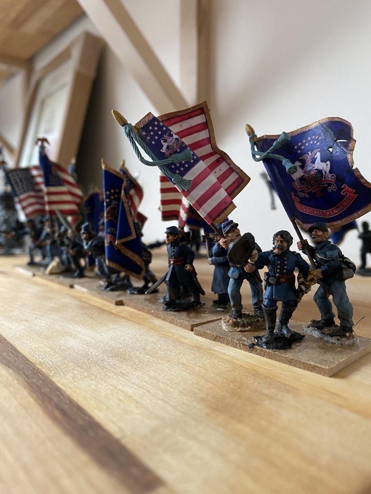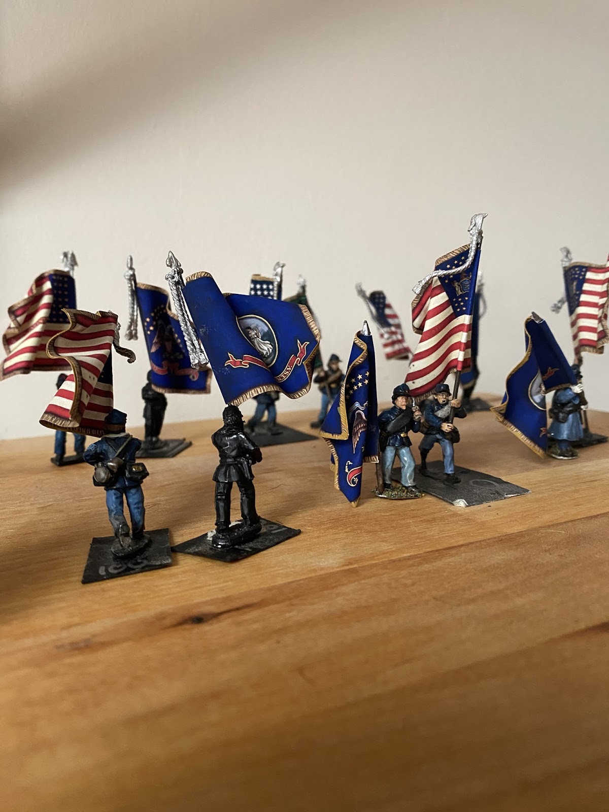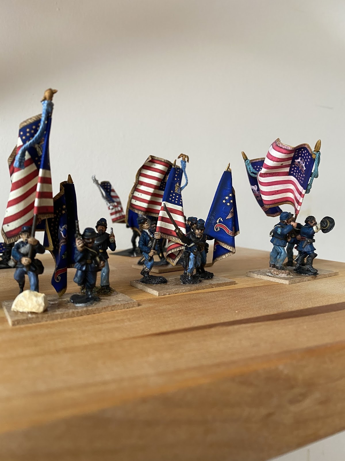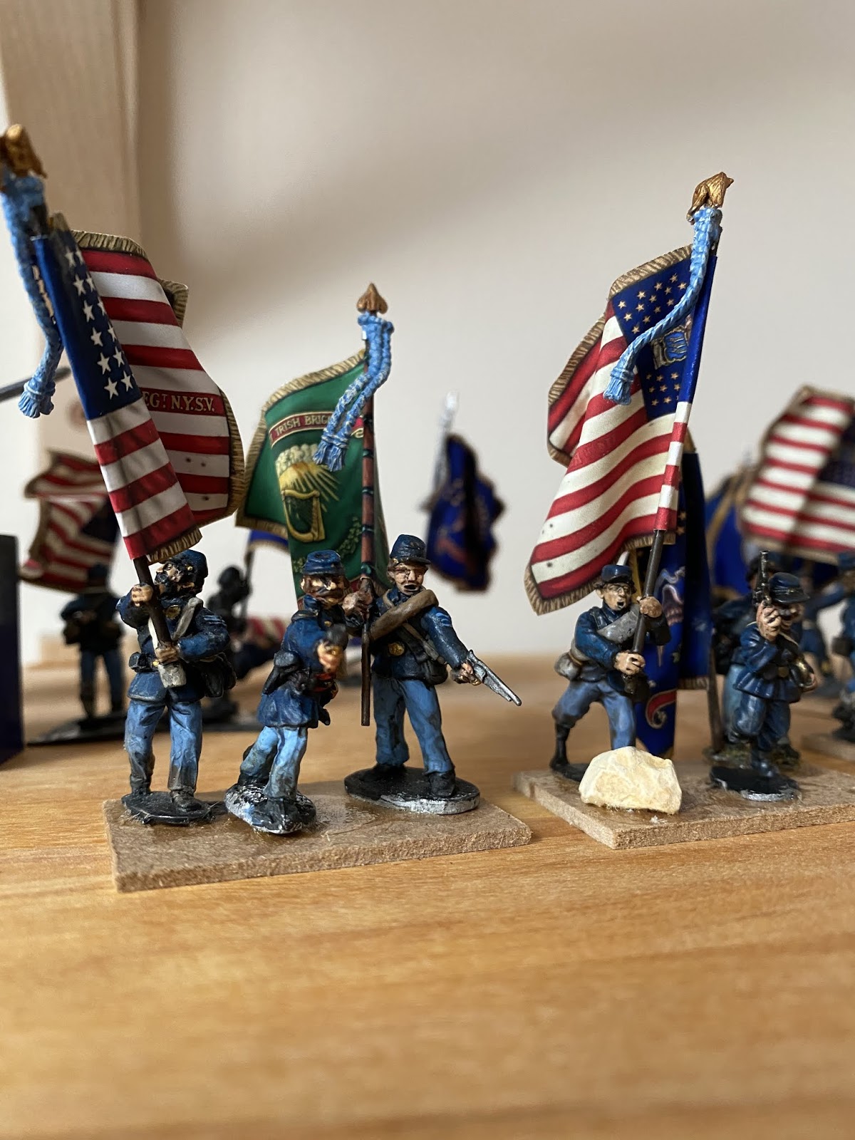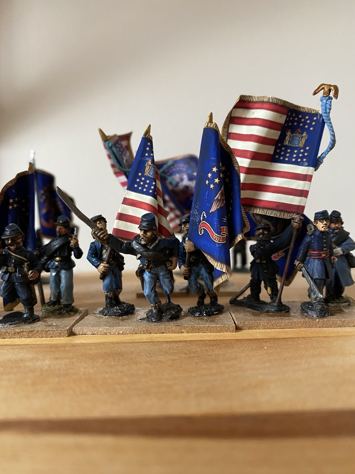 boy Hurrah boys Hurrah! By iron-mitten.blogspot.com Published On :: Mon, 20 Apr 2020 07:42:00 +0000 I thought I would give myself a lock down project to see if I could get some more Union troops done. The first batch were done some months ago and just left in a draw ( getting slightly damaged). This second lot, I just thought ‘too hell with it’ and decided to Dip them all in strong tone. This made them much more fun and quicker to paint, it also meant they were a lot more tougher than the first batch. The third batch were the original figures painted up around 1998, brought up to muster with a retouch of paint. Rather than paint individual regiments, I’m going for the Regimental Fire and Fury approach by painting a horde of generic bases that can be used for a multitude of regiments. Above is the first batch, shaded with inks and just matte varnished with spray varnish. A horde of standards, I stuck some on unpainted figures as I couldn’t be fussed to go back and do it all again. I decided it will be easier to paint the figure around the standard than go through another night of glue and fiddly scissors. These photos are out of order, this shows some of the combined forces rebased at last. Although I’m going to be using Bonny Blue Flag rules from Cavalier books, I’m basing them using Regimental Fire and Fury ratios. This is so I can use their fantastic scenario books for battles. These are great for the detailed maps and accurate troop numbers of the forces involved. Although I won’t be playing their core rules these scenario books are an amazing resource. The idea has always been to take my old collection from the Nineties and update them with many more different poses. This regiment being revamped was one featuring mostly Dixon figures, so I used a lot of Dixon miniatures in many different loading poses to add to it. More rebased figures, this was great because even though I had a rough idea of how many new bases there would be, I was surprised at how many just kept coming from all the batch’s combined.Above, are some strips of figures Dipped in strong tone. Basing them on cereal packets was great because the cardboard can be bent, allowing you to get all around the figure to paint it. It’s the next day now and I managed to base up some of those command bases. The eagles and spear points are from Steve Barber miniatures. Full Article American Civil War Dip
