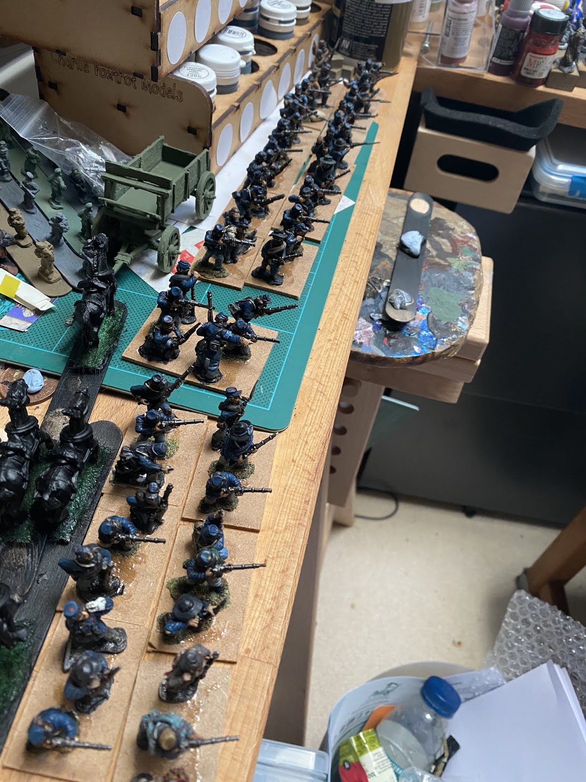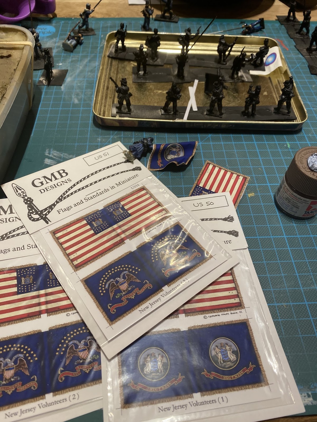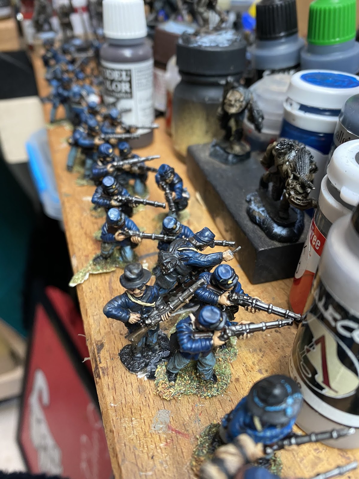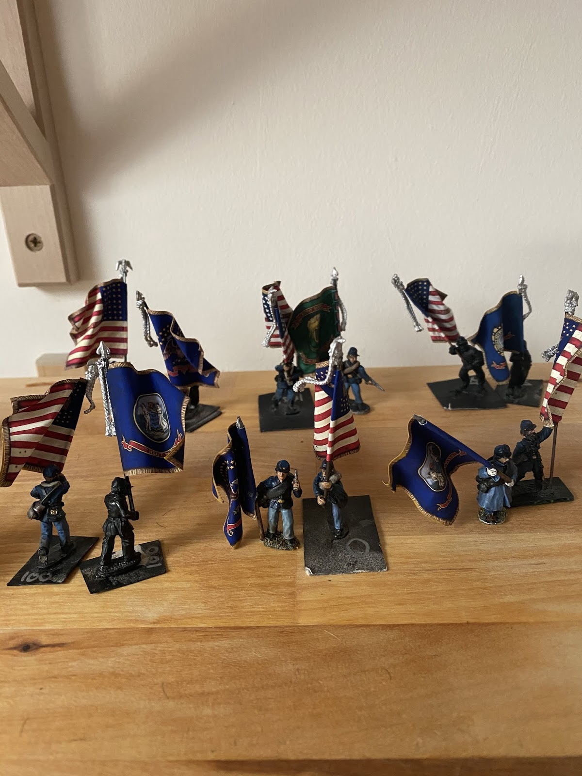 boy Hurrah boys Hurrah! By iron-mitten.blogspot.com Published On :: Mon, 20 Apr 2020 07:42:00 +0000 I thought I would give myself a lock down project to see if I could get some more Union troops done. The first batch were done some months ago and just left in a draw ( getting slightly damaged). This second lot, I just thought ‘too hell with it’ and decided to Dip them all in strong tone. This made them much more fun and quicker to paint, it also meant they were a lot more tougher than the first batch. The third batch were the original figures painted up around 1998, brought up to muster with a retouch of paint. Rather than paint individual regiments, I’m going for the Regimental Fire and Fury approach by painting a horde of generic bases that can be used for a multitude of regiments. Above is the first batch, shaded with inks and just matte varnished with spray varnish. A horde of standards, I stuck some on unpainted figures as I couldn’t be fussed to go back and do it all again. I decided it will be easier to paint the figure around the standard than go through another night of glue and fiddly scissors. These photos are out of order, this shows some of the combined forces rebased at last. Although I’m going to be using Bonny Blue Flag rules from Cavalier books, I’m basing them using Regimental Fire and Fury ratios. This is so I can use their fantastic scenario books for battles. These are great for the detailed maps and accurate troop numbers of the forces involved. Although I won’t be playing their core rules these scenario books are an amazing resource. The idea has always been to take my old collection from the Nineties and update them with many more different poses. This regiment being revamped was one featuring mostly Dixon figures, so I used a lot of Dixon miniatures in many different loading poses to add to it. More rebased figures, this was great because even though I had a rough idea of how many new bases there would be, I was surprised at how many just kept coming from all the batch’s combined.Above, are some strips of figures Dipped in strong tone. Basing them on cereal packets was great because the cardboard can be bent, allowing you to get all around the figure to paint it. It’s the next day now and I managed to base up some of those command bases. The eagles and spear points are from Steve Barber miniatures. Full Article American Civil War Dip
