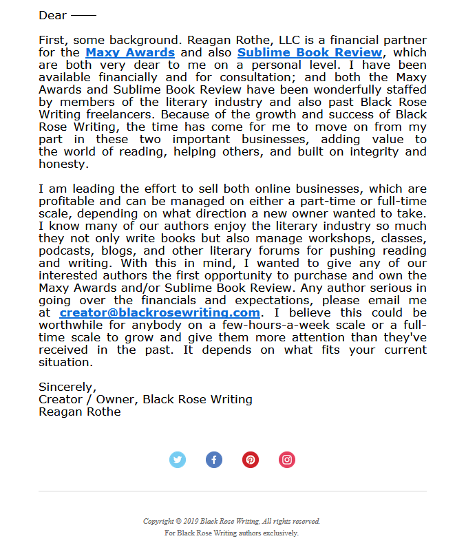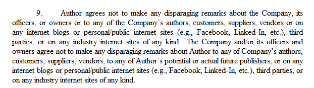 publisher Publisher Alerts: Complaints at Month9 Books, Nonstandard Business Practices at Black Rose Writing By feedproxy.google.com Published On :: Mon, 25 Nov 2019 17:45:00 +0000 Posted by Victoria Strauss for Writer Beware®In mid-2016, I wrote about YA publisher Month9 Books' abrupt decision to scale back its list, reverting rights to as many as 50 authors across all its imprints. Explaining the culling, Month9 founder and CEO Georgia McBride cited her own health problems, along with staffing issues and the company's "substantial growing pains" over the past six to nine months.McBride's announcement triggered a surge of complaints from Month9 authors, who described a host of serious problems at the company, including late or missing payments (for staff as well as authors), problems with royalty accounting, delayed pub dates, broken marketing promises, overcrowded publication schedules, communications breakdowns, and harsh treatment and bullying by McBride.According to authors and staff, these problems were not new or even recent, but had been ongoing for a long time. Why had authors kept silent? Almost every writer who contacted me mentioned their fear of retaliation--along with the draconian NDA included in Month9's contracts. I've rarely encountered a situation where authors seemed so fearful of their publisher.Things quieted down after the initial flood of revelations, as they often do. Month9 survived and kept on publishing, though its list continued to shrink: between a high point in 2016 and now, the number of titles appears to have fallen about 50%. Apart from a handful of additional complaints in late 2016 and early 2017 (similar to this one), I didn't hear much about Month9 in the years following.Until now. Over the past few weeks, I've been contacted by multiple writers who say they are still suffering from the same problems that surfaced in 2016: primarily, late (sometimes very late) royalty and subrights advance payments and statements (in many cases received only after persistent prodding by authors and their agents), and allegations of irregularities in royalty reporting.The intimidation level, too, seems not to have changed. Most of the authors told me that they feared reprisal for coming forward, and asked me specifically not to mention their names or book titles. (Writer Beware never reveals names or other unique identifying information, unless we receive specific permission from the individual. That disclaimer is included on our website and in our correspondence.)If you've been following the recent ChiZine scandal, you may be feeling some deja vu--notably, in the alleged existence of a toxic culture within the publisher that makes authors fearful and and helps to keep them silent. It's disappointing to learn that even if the issues that thrust Month9 into the spotlight three years ago have gone quiet, they don't seem to have eased. Writers be warned.******I wrote about Black Rose Writing in 2009, in connection with its requirement that authors buy their own books. Writers who submitted were asked how many of their own books they planned to buy; their response was then written into their contracts. (Book purchase requirements are back-end vanity publishing: even if writers aren't being asked to pay for production and distribution, they still must hand over money in order to see their work in print.)Black Rose got rid of the book purchase requirement a few years later, and claimed to be a completely fee-free publisher. I had my suspicions that money might still somehow be involved, though...and as it turns out, I wasn't wrong.I've recently learned that new Black Rose authors receive a Cooperative Marketing Catalog that sells a range of pay-to-play marketing and promotional services, with costs ranging from a few hundred dollars to four figures. For instance:It's true that purchase is optional (though I would guess that authors are heavily solicited to buy). But reputable publishers don't sell marketing services to their authors--and in any case, much of what's on offer are things that other publishers, even very small ones, do for their authors free of charge, as part of the publication process.That's not the only way in which Black Rose authors are encouraged to pay their publisher. Owner Reagan Rothe is a self-described "financial partner" in two additional businesses: the Maxy Awards, a high entry fee book competition that donates "a large part of every entry" to a charity (how large? No idea; that information is not provided); and Sublime Book Review, a paid review service.Though Mr. Rothe's financial interest in these businesses is not disclosed on the business's websites, both businesses are clearly energetically promoted to Black Rose authors. On Sublime's website, nineteen of the first 20 book reviews are for Black Rose books. There's also this, from the marketing catalog (note the lack of disclaimer):As for the Maxys, thirteen of the 17 winners and runners-up for 2019 are Black Rose books.Mr. Rothe does admit his relationship with the businesses in this recent email to Black Rose authors--though only to afford them yet another opportunity to give him money: Full Article
