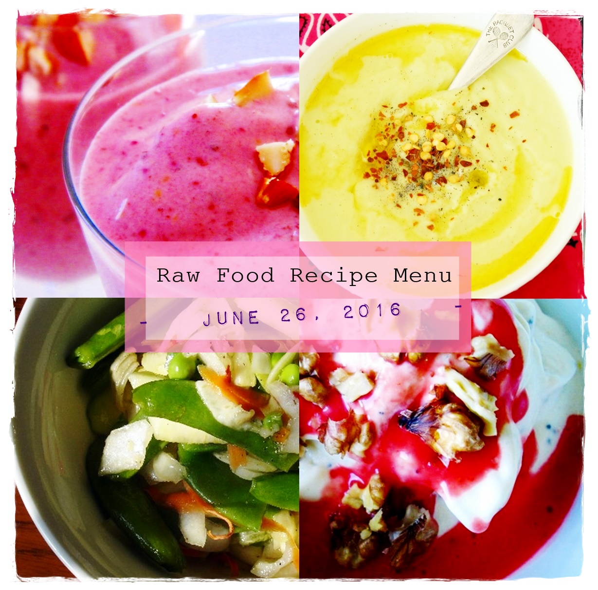 june Raw Food Recipe Menu: June 26th, 2016 By rawon10.blogspot.com Published On :: Mon, 27 Jun 2016 07:23:00 +0000 Breakfast Strawberry Flax Smoothieserves 2 ~ $1.28 per serving Just two tablespoons of flax seeds, weighing in at 95 calories, contains over 140% of the daily value of omega 3 fatty acids. These fatty acids can protect against diabetes, cardiovascular disease, and cancer, and also decrease inflammation. Because the nutrients in flax seeds are better absorbed when ground ~ and a lot more palatable! ~ I've used the ground seeds in this recipe. ingredients 2 bananas, frozen and sliced ($.50)1 cup frozen strawberries ($1.00)4 tablespoons flax seeds, ground ($.40)1 cup almond milk ($.45) a few almonds, chopped directionsIn a blender, combine all ingredients and puree until very smooth.Garnish with a few chopped almonds, if desired. nutritional information: calories: 308 fat: 11 gr carb: 55 protein: 7 gr LunchSquash and Cauliflower Soupserves 2 ~ $1.75 per servingThis is a light but also filling lunch or snack and cauliflower is in season right now. It's pretty low in calories and not very expensive. I've been known to eat the whole batch, is what I'm saying! I like to add some cayenne and crushed red pepper flakes, but, as is true of most things in life, heat is optional ... add as much or little as you like. ingredients 1 1/2 cup peeled and chopped zucchini and/or summer squash ($1.20)1 1/2 cup chopped cauliflower ($1.00)1 cup peeled and chopped apple ($1.00)1/4 cup olive oil, or any one of your favorite oils ($.20)1 tablespoon chopped onion ($.10)1 teaspoon garlic powder1/2 teaspoon cumin1/4 teaspoon cayenne powder1 teaspoon salt, or to taste1/2 teaspoon pepper, or to taste directionsPlace all ingredients in high powered blender and process for a minute or two until very smooth and creamy. Add a drizzle of your favorite oil and some crushed red pepper flakes. nutritional information: calories: 390 fat: 32 gr carbs: 54 protein: 5 Dinner Spring Noodlesserves 2 ~ $1.98 per serving2 medium zucchini, noodled ($2.30) 1 medium onion, chopped ($.05) 1/2 lb baby snap peas ($.80) 1 carrot, grated ($.10) 2 tablespoons olive oil ($.20) 2 tablespoons agave ($.20) 2 tablespoons apple cider vinegar ($.20) 2 cloves garlic, pressed ($.10) 1/4 teaspoon salt 1/4 teaspoon pepper 1 teaspoon red pepper flakesnoodled verb: to improvise, experiment, or think creatively; to make or devise freely as an exercise or experiment I used to think breaded and fried was the only way to eat zucchini. Now, I'm totally into raw zucchini noodles. They're so easy to make and have a wonderful but mild flavor of their own, so they work well with just about everything. Make noodles out the zucchini with a spiralizer, grater, or with a vegetable peeler. Toss the noodles together with the whole snap peas, chopped onion, and grated carrot. In a small cup, whisk together the oil, agave, vinegar, garlic, salt, pepper, and red pepper flakes. Toss with the noodles until coated. These can be served as is, or marinated for an hour or so, or gently dehydrated for a bit. nutritional information: calories: 343 fat: 14 gr carbs: 46 gr protein: 10 gr DessertLemon Poppy Seed Ice Cream with Strawberry Sauceserves 2 ~ $1.10 per serving ingredients4 bananas, sliced and frozen ($.60)juice and zest of one lemon ($.69)1 tablespoon poppy seeds ($.30) 1 cup strawberries ($.45)1 tablespoon agave ($.10)2 tablespoons chopped walnuts ($.15)pinch saltBanana ice cream is wonderful. And it's amazingly simple to make with just a food processor.The strawberry sauce should be made first and set aside. In a bullet type blender, puree the strawberries and agave until very smooth. In a food processor fitted with an "S" blade, process the frozen bananas and lemon juice and zest until creamy like soft serve ice cream. It can take a bit of prodding and scraping to get the bananas going in the food processor, but it's worth it. Once creamy, add the poppy seeds and give a whir or two to incorporate.Serve with the strawberry sauce and walnuts. nutritional information: calories: 345 fat: 6 gr carbs: 77 gr protein: 5 gr Total cost for the day: $6.11total calories: 1,386total fat: 63 grtotal carb: 232 gr total protein: 27 gr Full Article