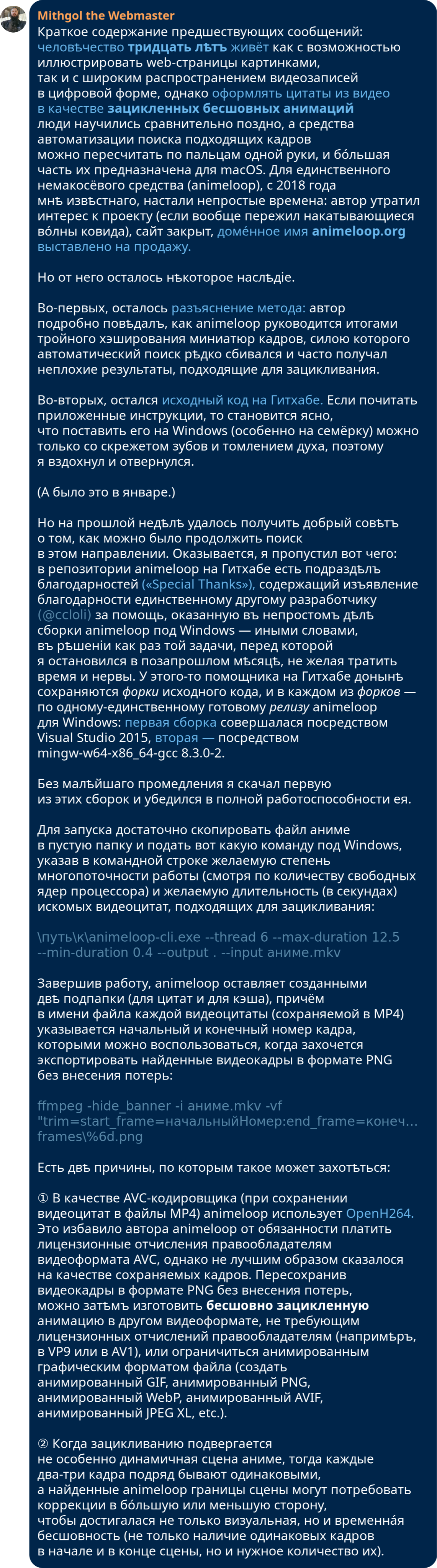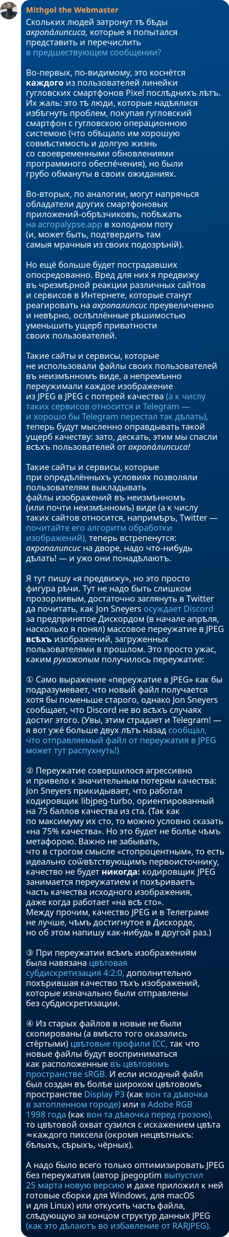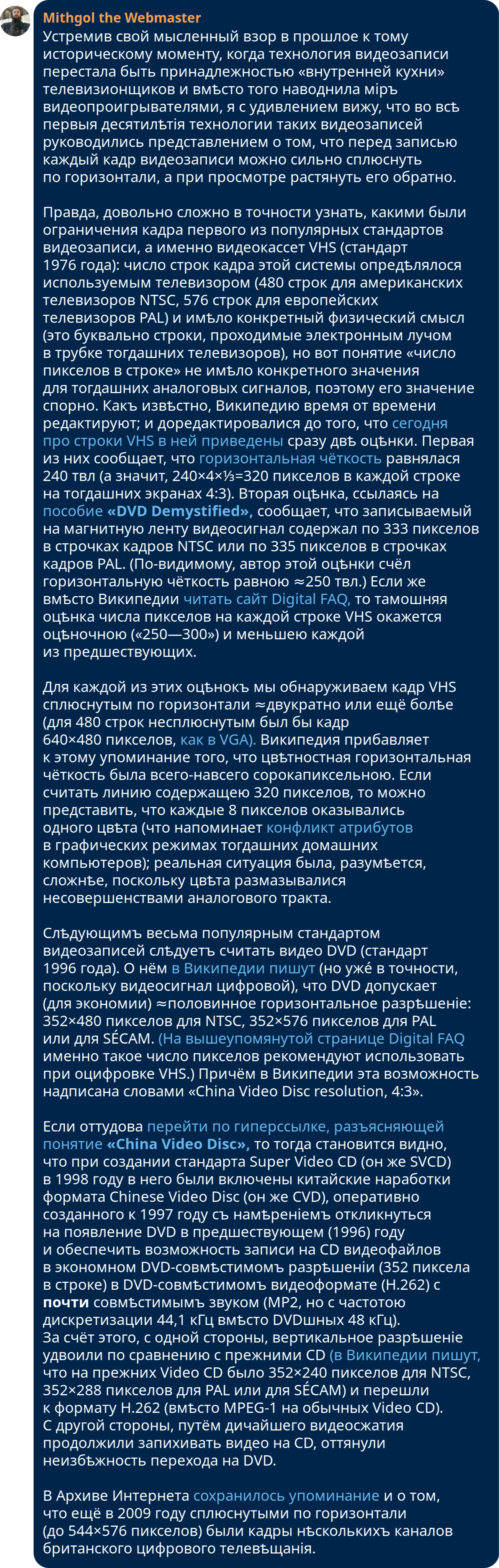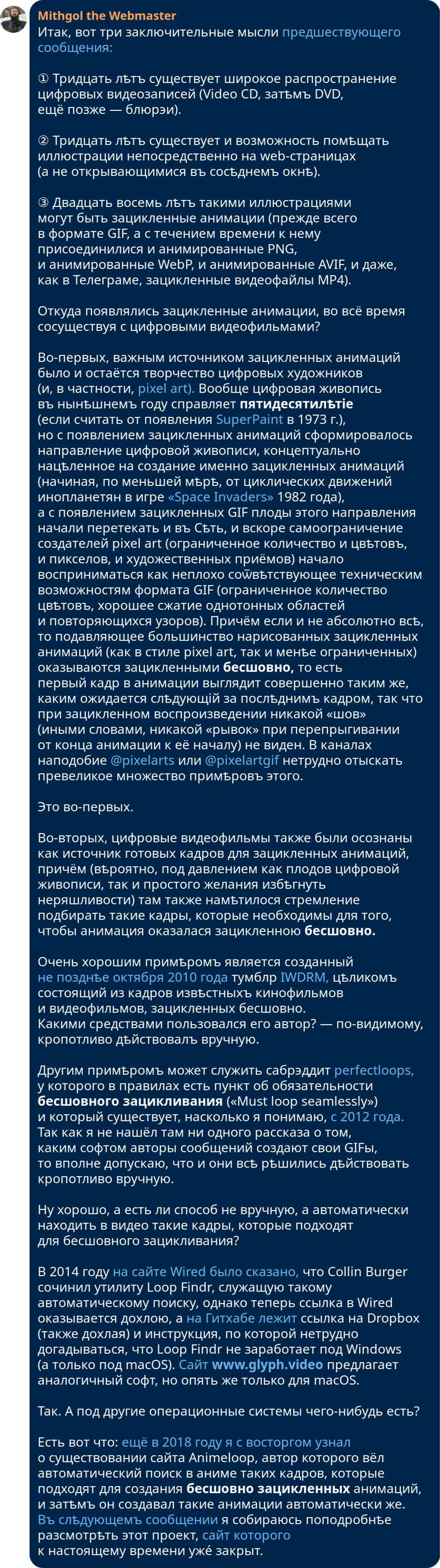 id Twitter: @FidonetRunes By ipfs.io Published On :: Sun, 19 Mar 2023 18:49:06 GMT Абырвалг (@senbermyau) 2023-03-01 09:11:59 (UTC)https://twitter.com/senbermyau/status/1630858410513121280Утро. Набитый заспанными людьми автобус. Чувак лет 30 достал из рюкзака термос, налил в крышечку и несколько остановок неспешно и с наслаждением потягивал дымящееся нечто… Потом аккуратно убрал всё, извлек из рюкзака толстенный сборник Сапковского и вдохновенно принялся читать.Mithgol the Webmaster (@FidonetRunes) 2023-03-11 21:46:43 (UTC)https://twitter.com/FidonetRunes/status/1634672222852841472[19:12] Кто-то думал, что дальше https://twitter.com/FidonetRunes/status/1459224262405931017 падать некуда? — а вот скриншот нового сообщения Твиттера:① Видеозаписи прямых эфиров сотрут.② Не пишут когда, а пишут «скоро».③ Совѣтуютъ Help Center, гдѣ нѣтъ ни этой новости, ни разумных итогов поиска по «live». Mithgol the Webmaster (@FidonetRunes) 2023-03-11 22:54:09 (UTC)https://twitter.com/FidonetRunes/status/1634689195720548352[19:13] Дальше ещё хуже. Средство https://www.pscp.tv/account/your-data/broadcasts позволяет скачать видеозаписи, но:① только своих эфиров (я бы хотѣлъ, ясное дѣло, и эфиры других лиц, на которые ссылался),② создан в 2021 году (съ тѣхъ пор провѣряли ли?),③ обѣщаетъ проработать «нѣсколько часов».Mithgol the Webmaster (@FidonetRunes) 2023-03-11 22:54:10 (UTC)https://twitter.com/FidonetRunes/status/1634689199583494146[19:14] Чтобы не сидѣть просто так «нѣсколько часов» в ожидании результата, который в лучшем случае притащит ТОЛЬКО мои собственные прямые эфиры (в худшем же — зря пройдут тѣ часы), поневоле перелопачиваю микроблогозаписи за половину десятилѣтія, вручную скармливаю URLы в yt-dlp.Mithgol the Webmaster (@FidonetRunes) 2023-03-11 22:54:11 (UTC)https://twitter.com/FidonetRunes/status/1634689203282878464[19:15] В результате работы yt-dlp получается сырой видеопоток:① Нѣтъ реплик чата (стримеры общаются с невидимыми и нѣмыми собесѣдниками).② Нѣтъ метаданных о положении экрана смартфона (ориентация ВСЕГДА портретная, а не альбомная).Размѣръ кадра ужасный: 320×568 пикселов.Mithgol the Webmaster (@FidonetRunes) 2023-03-11 22:54:12 (UTC)https://twitter.com/FidonetRunes/status/1634689205799464960[19:16] Даже в таком чудовищном качестве и с таким чудовищным недостатком важных данных это всё равно бесконечно, бесконечно лучше, чѣмъ нифигушеньки. Но и показать результат такого скачивания нельзя без предисловий о том, чего недостаёт; а не то зрители придут вдруг в изумление.Mithgol the Webmaster (@FidonetRunes) 2023-03-11 22:54:12 (UTC)https://twitter.com/FidonetRunes/status/1634689208135700482[19:17] Получается, что всѣ эти видеозаписи лучше всего хранить в одном экземпляре для личного просмотра (может быть, сдѣлать ещё страховочную копию на диск BD), а не класть в этаком виде во блог. Остро раздражает то обстоятельство, что в Твиттере так сэкономили на размѣрѣ кадра.Mithgol the Webmaster (@FidonetRunes) 2023-03-11 22:54:13 (UTC)https://twitter.com/FidonetRunes/status/1634689210450935809[19:18] Ещё хуже неопредѣлённость дедлайна стирания видеозаписей, из-за которой даже не понятно, много ли потеряю, если прямо сейчас усну. Оттого нѣкоторые авторы (как https://twitter.com/ThisDNE/status/1634591588490903553 напримѣръ) в FAQ https://help.twitter.com/en/using-twitter/periscope-faq видят «до конца марта», не дочитывая «2021 г.».Mithgol the Webmaster (@FidonetRunes) 2023-03-12 11:29:10 (UTC)https://twitter.com/FidonetRunes/status/1634879201198346241[19:19] Ѿдѣльным кошмаром становится то мрачное обстоятельство, что панорамные сферические эфиры #Periscope360 (по адресу https://t.co/6qqtSda9af новость об их появлении, по адресу https://twitter.com/Alexpettitt/status/814229532576124928 первый в истории примѣръ) тоже скачиваются переужатыми до 320×568 пикселов.Mithgol the Webmaster (@FidonetRunes) 2023-03-12 11:29:11 (UTC)https://twitter.com/FidonetRunes/status/1634879204658495489[19:20] Поэтому три кошмара:① Естественная ориентация 360°×180° является альбомною, но искусственно приведена к портретной. (Ко