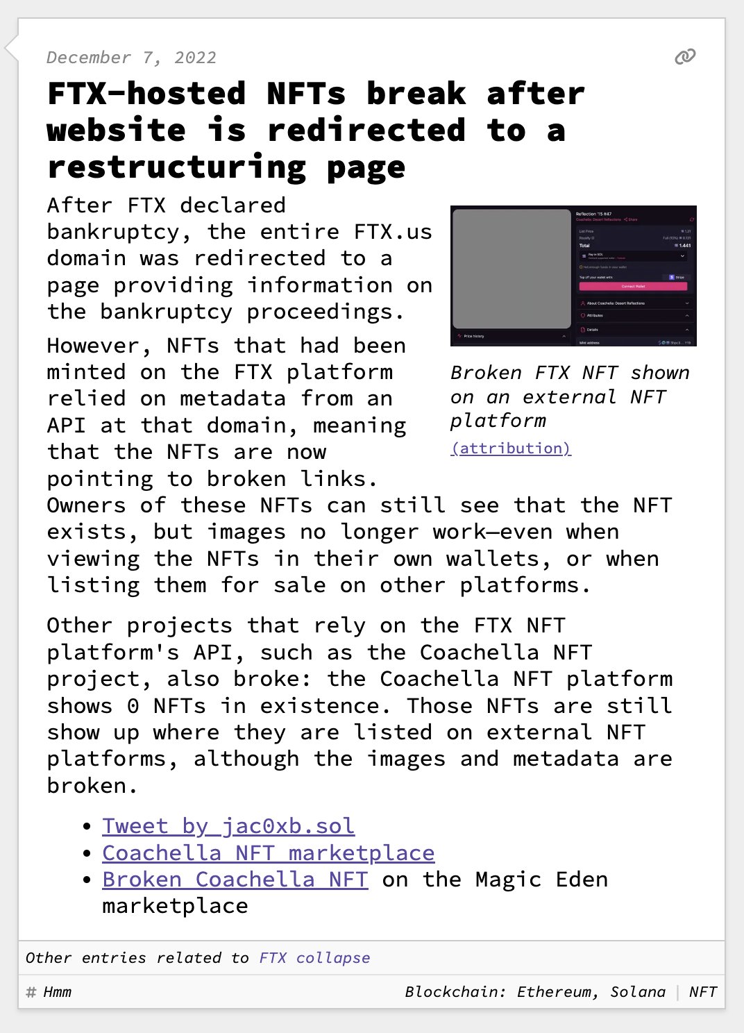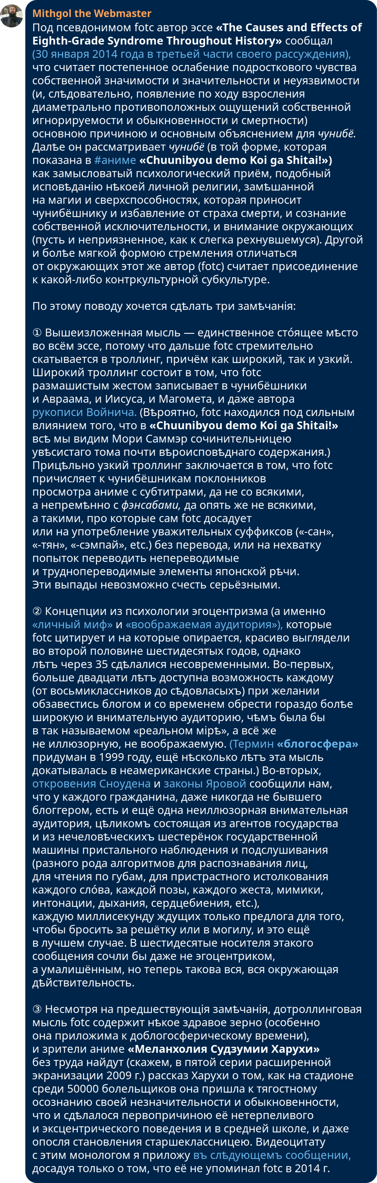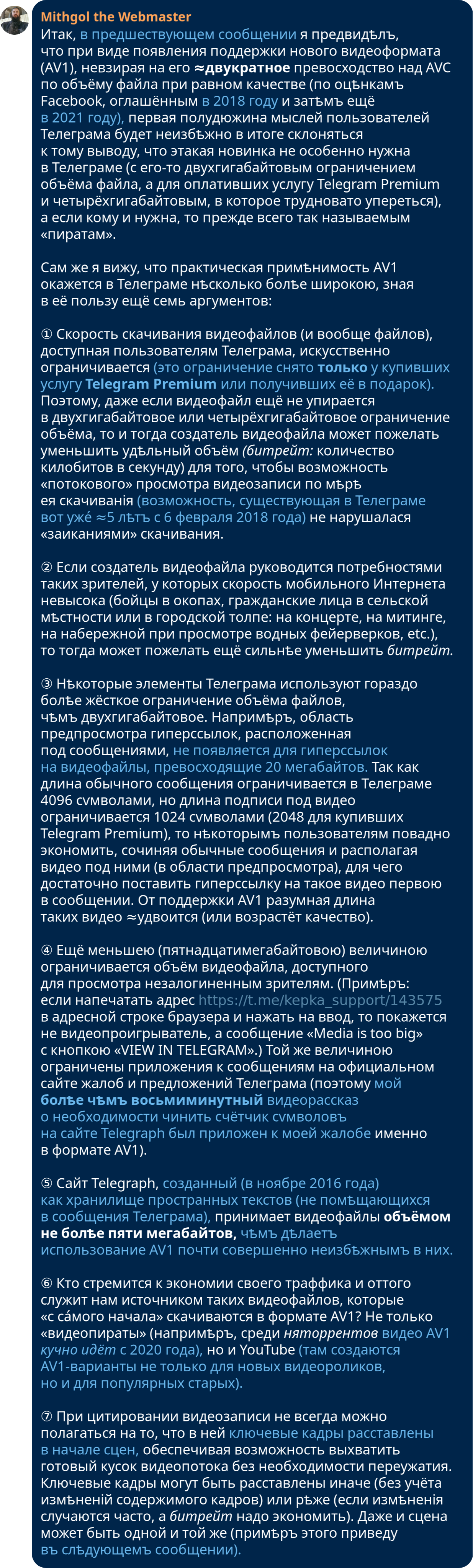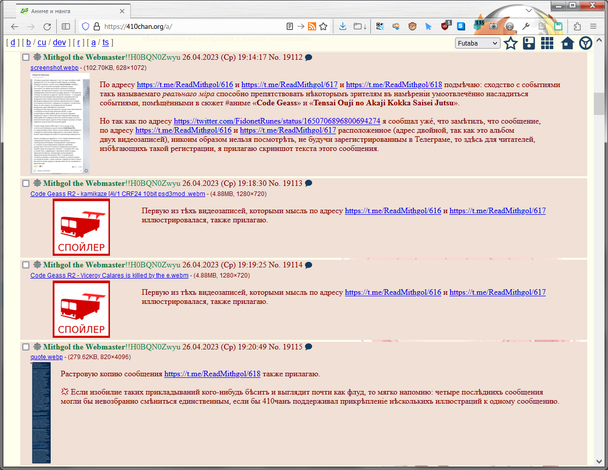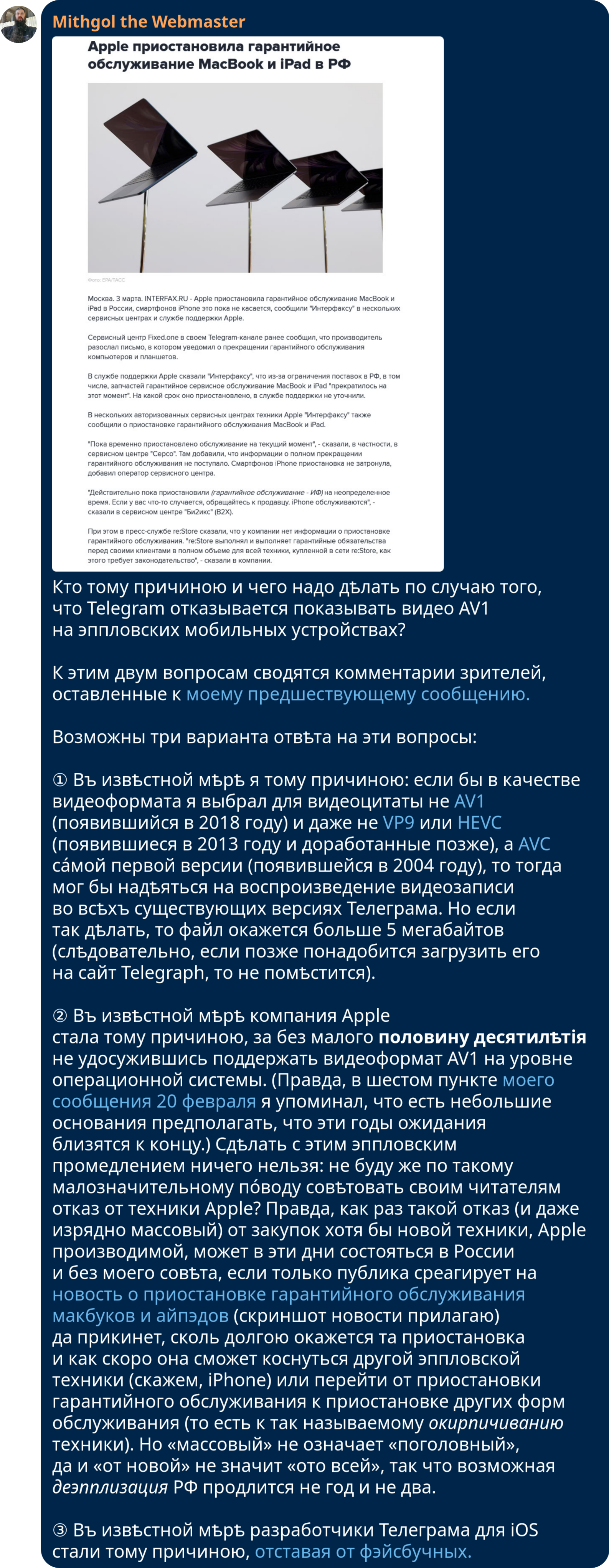 id Twitter: @FidonetRunes By ipfs.io Published On :: Sun, 19 Mar 2023 18:49:06 GMT Абырвалг (@senbermyau) 2023-03-01 09:11:59 (UTC)https://twitter.com/senbermyau/status/1630858410513121280Утро. Набитый заспанными людьми автобус. Чувак лет 30 достал из рюкзака термос, налил в крышечку и несколько остановок неспешно и с наслаждением потягивал дымящееся нечто… Потом аккуратно убрал всё, извлек из рюкзака толстенный сборник Сапковского и вдохновенно принялся читать.Mithgol the Webmaster (@FidonetRunes) 2023-03-11 21:46:43 (UTC)https://twitter.com/FidonetRunes/status/1634672222852841472[19:12] Кто-то думал, что дальше https://twitter.com/FidonetRunes/status/1459224262405931017 падать некуда? — а вот скриншот нового сообщения Твиттера:① Видеозаписи прямых эфиров сотрут.② Не пишут когда, а пишут «скоро».③ Совѣтуютъ Help Center, гдѣ нѣтъ ни этой новости, ни разумных итогов поиска по «live». Mithgol the Webmaster (@FidonetRunes) 2023-03-11 22:54:09 (UTC)https://twitter.com/FidonetRunes/status/1634689195720548352[19:13] Дальше ещё хуже. Средство https://www.pscp.tv/account/your-data/broadcasts позволяет скачать видеозаписи, но:① только своих эфиров (я бы хотѣлъ, ясное дѣло, и эфиры других лиц, на которые ссылался),② создан в 2021 году (съ тѣхъ пор провѣряли ли?),③ обѣщаетъ проработать «нѣсколько часов».Mithgol the Webmaster (@FidonetRunes) 2023-03-11 22:54:10 (UTC)https://twitter.com/FidonetRunes/status/1634689199583494146[19:14] Чтобы не сидѣть просто так «нѣсколько часов» в ожидании результата, который в лучшем случае притащит ТОЛЬКО мои собственные прямые эфиры (в худшем же — зря пройдут тѣ часы), поневоле перелопачиваю микроблогозаписи за половину десятилѣтія, вручную скармливаю URLы в yt-dlp.Mithgol the Webmaster (@FidonetRunes) 2023-03-11 22:54:11 (UTC)https://twitter.com/FidonetRunes/status/1634689203282878464[19:15] В результате работы yt-dlp получается сырой видеопоток:① Нѣтъ реплик чата (стримеры общаются с невидимыми и нѣмыми собесѣдниками).② Нѣтъ метаданных о положении экрана смартфона (ориентация ВСЕГДА портретная, а не альбомная).Размѣръ кадра ужасный: 320×568 пикселов.Mithgol the Webmaster (@FidonetRunes) 2023-03-11 22:54:12 (UTC)https://twitter.com/FidonetRunes/status/1634689205799464960[19:16] Даже в таком чудовищном качестве и с таким чудовищным недостатком важных данных это всё равно бесконечно, бесконечно лучше, чѣмъ нифигушеньки. Но и показать результат такого скачивания нельзя без предисловий о том, чего недостаёт; а не то зрители придут вдруг в изумление.Mithgol the Webmaster (@FidonetRunes) 2023-03-11 22:54:12 (UTC)https://twitter.com/FidonetRunes/status/1634689208135700482[19:17] Получается, что всѣ эти видеозаписи лучше всего хранить в одном экземпляре для личного просмотра (может быть, сдѣлать ещё страховочную копию на диск BD), а не класть в этаком виде во блог. Остро раздражает то обстоятельство, что в Твиттере так сэкономили на размѣрѣ кадра.Mithgol the Webmaster (@FidonetRunes) 2023-03-11 22:54:13 (UTC)https://twitter.com/FidonetRunes/status/1634689210450935809[19:18] Ещё хуже неопредѣлённость дедлайна стирания видеозаписей, из-за которой даже не понятно, много ли потеряю, если прямо сейчас усну. Оттого нѣкоторые авторы (как https://twitter.com/ThisDNE/status/1634591588490903553 напримѣръ) в FAQ https://help.twitter.com/en/using-twitter/periscope-faq видят «до конца марта», не дочитывая «2021 г.».Mithgol the Webmaster (@FidonetRunes) 2023-03-12 11:29:10 (UTC)https://twitter.com/FidonetRunes/status/1634879201198346241[19:19] Ѿдѣльным кошмаром становится то мрачное обстоятельство, что панорамные сферические эфиры #Periscope360 (по адресу https://t.co/6qqtSda9af новость об их появлении, по адресу https://twitter.com/Alexpettitt/status/814229532576124928 первый в истории примѣръ) тоже скачиваются переужатыми до 320×568 пикселов.Mithgol the Webmaster (@FidonetRunes) 2023-03-12 11:29:11 (UTC)https://twitter.com/FidonetRunes/status/1634879204658495489[19:20] Поэтому три кошмара:① Естественная ориентация 360°×180° является альбомною, но искусственно приведена к портретной. (Ко