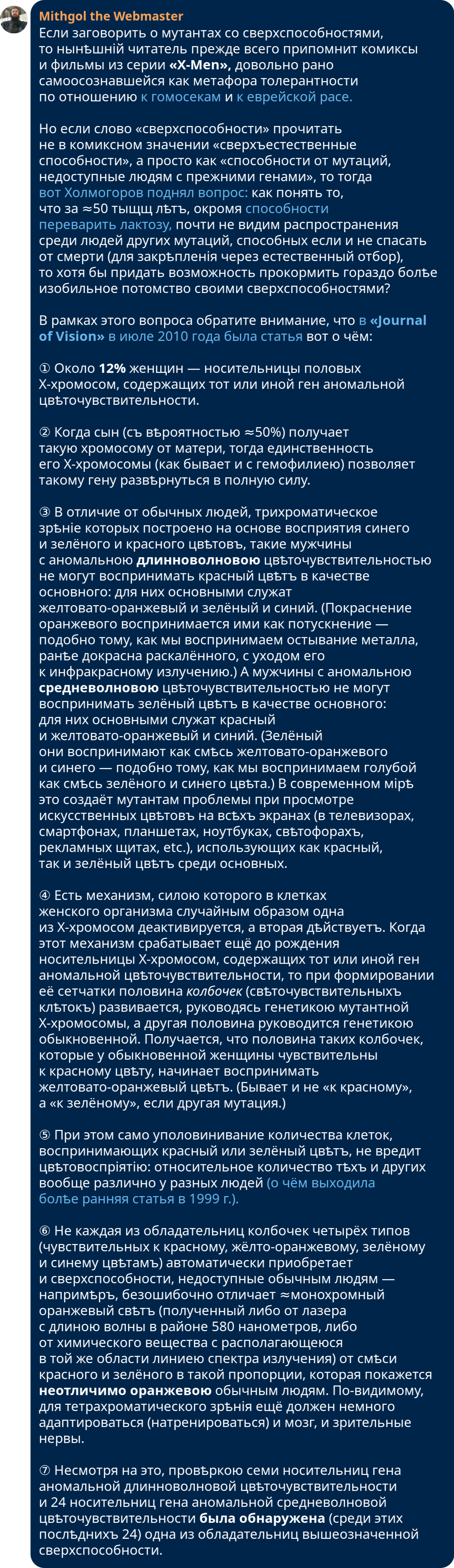 id Twitter: @FidonetRunes By ipfs.io Published On :: Wed, 19 Apr 2023 06:45:36 GMT Elon Musk (@elonmusk) 2023-04-04 18:52:32 (UTC)https://twitter.com/elonmusk/status/1643325697363161088If the Dem Party had a time machine Андрей Ситник (@andrey_sitnik) 2023-04-08 11:42:39 (UTC)https://twitter.com/andrey_sitnik/status/1644667063699423233Почему тигр оранжевый, если он хищник и должен быть незаметным?Просто у его жертв обычно лишь два типа рецепторов цвета (у человека 3). Они не видят разницы между оранжевым и зелёным (можно сравнить с некоторыми дальтониками у людей, у которых не работает один из рецепторов). Cardinal (@cardinalby) 2023-04-08 13:29:09 (UTC)https://twitter.com/cardinalby/status/1644693868229656576@andrey_sitnik А почему в процессе эволюции у его жертв не появились нужные рецепторы (как у нас) если это помогло бы им заметить тигра?Андрей Ситник (@andrey_sitnik) 2023-04-08 13:30:53 (UTC)https://twitter.com/andrey_sitnik/status/1644694303552204803@cardinalby Я думаю потому что в «архитектуре млекопитающих» проще развивать слух/нюх, а не зрение.У млекопитающих серьёзный костыль в зрении, который мешает нам видеть хорошо.У человека жуткий хак, чтобы костыль обойти.Cardinal (@cardinalby) 2023-04-08 15:36:32 (UTC)https://twitter.com/cardinalby/status/1644725922803642369@andrey_sitnik кажется, очень неполный ответ. Есть и другие трихроматические млекопитающие кроме нас. Я бы ожидал, что дихроматизм позволяет, например лучше видеть в темноте или замечать быстрое движение, а плюсы от трихроматизма меньше чем у нас из-за образа жизни.Андрей Ситник (@andrey_sitnik) 2023-04-08 15:42:59 (UTC)https://twitter.com/andrey_sitnik/status/1644727545621872641@cardinalby Да, Твиттер — много не засунуть. Вот ещё датели:У млекопитающих нервы идут поверх фоторецепторов, создавая сильные помехи.Поэтому у большинства млекопитающих зрение очень плохое. Проблему не исправить легко, так как порядок слоёв формируется ещё у эмбриона.Андрей Ситник (@andrey_sitnik) 2023-04-08 15:44:40 (UTC)https://twitter.com/andrey_sitnik/status/1644727969255129091@cardinalby Там не только нервы, но и сосуды идут поверх сетчатки ещё сильнее нарушая картинку.У человека зрение на порядок лучше большинства млекопитающих из-за жуткого хака.У нас в центре сетчатки нервы подсоединены под углом — создавая небольшую точку, расчищенную от помех.Андрей Ситник (@andrey_sitnik) 2023-04-08 15:45:48 (UTC)https://twitter.com/andrey_sitnik/status/1644728255298121729@cardinalby Только эта точки видит в большом разрешении. Вся остальная сетчатка из-за нервов и сосудов видит в очень низком разрешении.Но мозг этой точкой сканирует все объекты и «кеширует» их вид. Поэтому нам кажется, что мы видим чётко.Андрей Ситник (@andrey_sitnik) 2023-04-08 15:47:16 (UTC)https://twitter.com/andrey_sitnik/status/1644728626984747014@cardinalby Уровень хака у человека показывает насколько зрение фундаментально сломано у млекопитающих.Поэтому ставка делается на другие органы чувств.Да и у слуха/нюха есть куча плюсов. Они в темноте работают.Alkkar (@alkkar) 2023-04-08 11:51:40 (UTC)https://twitter.com/alkkar/status/1644669334000742402@andrey_sitnik Вот это офигеть, спасибо за крутой факт!Но, а почему тигр тогда не зеленый? Как попугай)очень хочется поговорить (@verywanttalk) 2023-04-09 08:43:59 (UTC)https://twitter.com/verywanttalk/status/1644984490643652610@alkkar @andrey_sitnik Потому что нет зелёного пигментаEugene Katella (@katellaevgenii) 2023-04-08 12:13:04 (UTC)https://twitter.com/katellaevgenii/status/1644674719260524544@alkkar @andrey_sitnik На нетфликсе есть документалка Life in colour как раз про всякие механизмы окраски у животных.Там вроде рассказывали, что у млекопитающих в принципе не существует зелёного пигмента для шерсти. Поэтому эволюционно у тигров подобрался максимально похожий для жертвы оранжевыйАндрей Ситник (@andrey_sitnik) 2023-04-08 11:54:45 (UTC)https://twitter.com/andrey_sitnik/status/1644670112459558913@alkkar Зелёный попугай совпадает с цветом растительности только для нашего зрения.Може