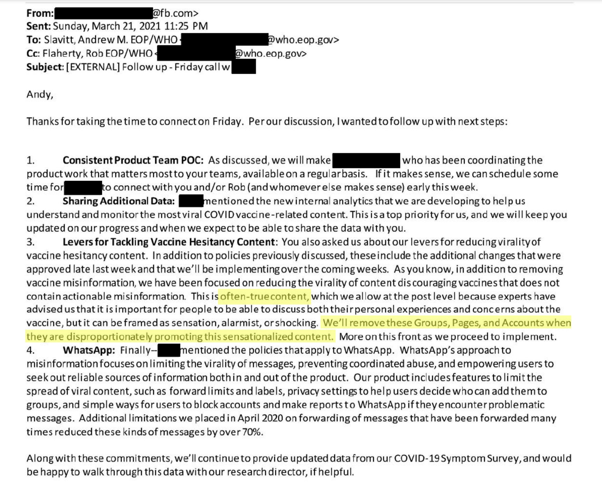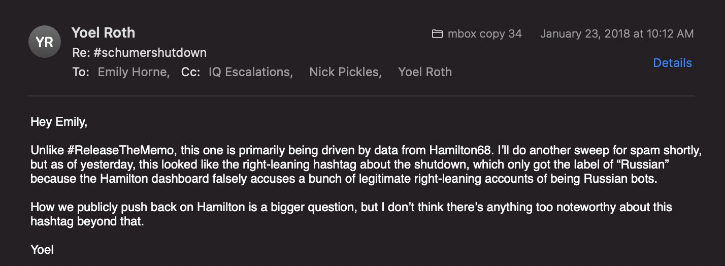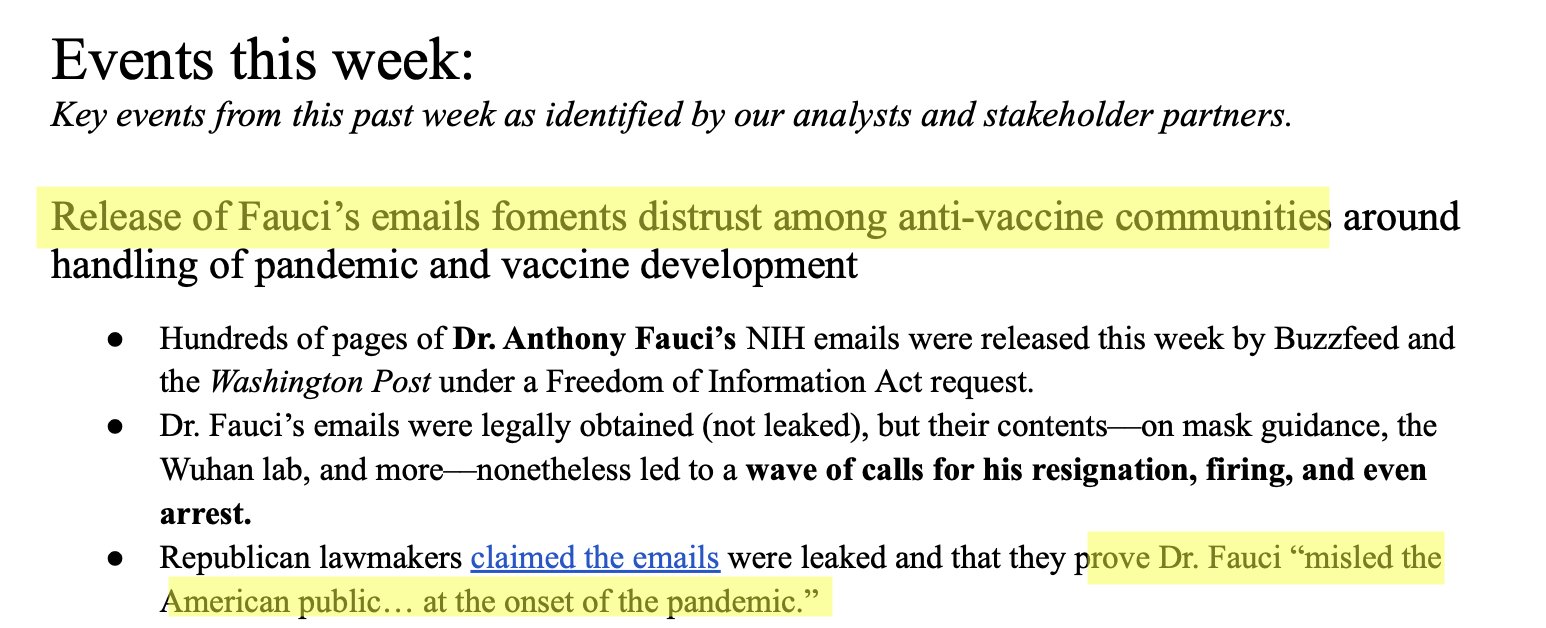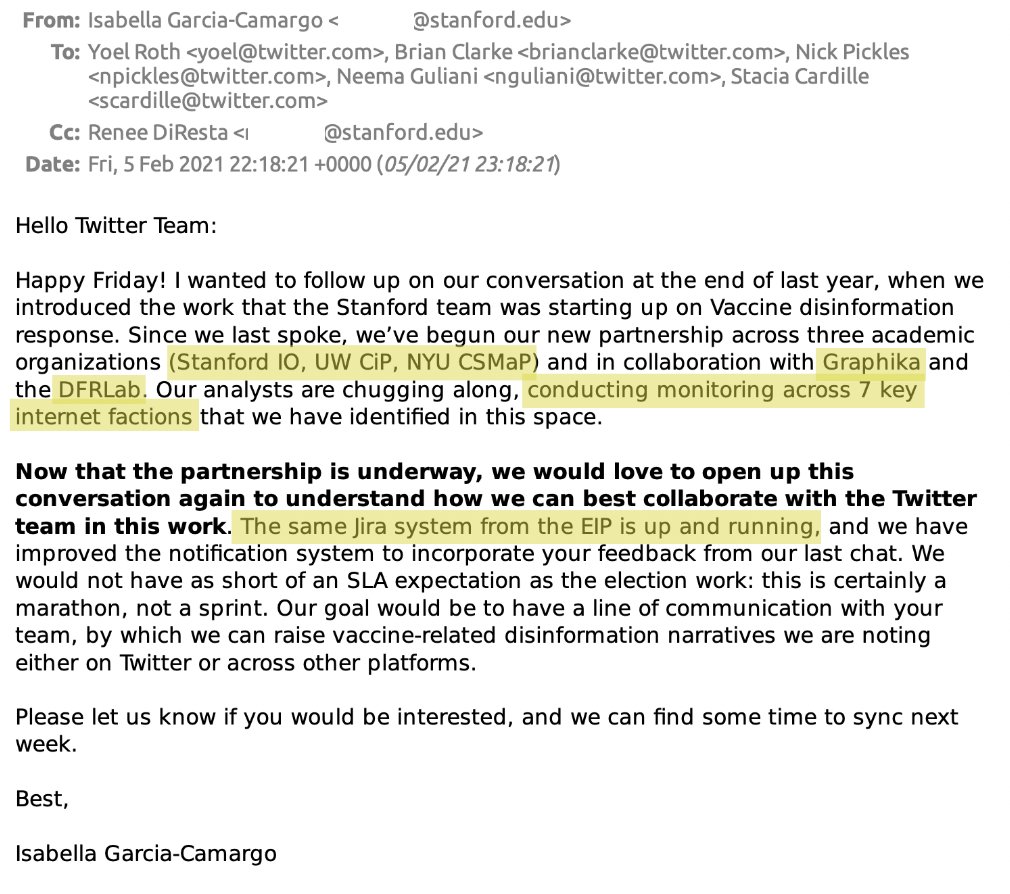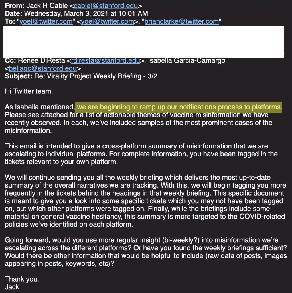 id Twitter: @FidonetRunes By ipfs.io Published On :: Sat, 25 Mar 2023 06:59:56 GMT No Context Chick Tracts (@No_Context_JTC) 2023-03-10 15:10:23 (UTC)https://twitter.com/No_Context_JTC/status/1634210093091766274Matt Taibbi (@mtaibbi) 2023-03-17 14:00:16 (UTC)https://twitter.com/mtaibbi/status/16367291666314321951.TWITTER FILES #19The Great Covid-19 Lie MachineStanford, the Virality Project, and the Censorship of “True Stories” Matt Taibbi (@mtaibbi) 2023-03-17 14:00:17 (UTC)https://twitter.com/mtaibbi/status/16367291689971097612.“The release of Dr. Anthony Fauci’s Spring 2020 emails… has been used to exacerbate distrust in Dr. Fauci.”“Increased distrust in Fauci’s expert guidance.” Matt Taibbi (@mtaibbi) 2023-03-17 14:00:18 (UTC)https://twitter.com/mtaibbi/status/16367291719959265283.“Reports of vaccinated individuals contracting Covid-19 anyway”; “natural immunity”; suggesting Covid-19 “leaked from a lab”; even “worrisome jokes”: Matt Taibbi (@mtaibbi) 2023-03-17 14:00:19 (UTC)https://twitter.com/mtaibbi/status/16367291754269655044.All were characterized as “potential violations” or disinformation “events” by the Virality Project, a sweeping, cross-platform effort to monitor billons of social media posts by Stanford University, federal agencies, and a slew of (often state-funded) NGOs.Matt Taibbi (@mtaibbi) 2023-03-17 14:00:19 (UTC)https://twitter.com/mtaibbi/status/16367291775114567705.Just before @ShellenbergerMD and I testified in the House last week, Virality Project emails were found in the #TwitterFiles describing “stories of true vaccine side effects” as actionable content. Matt Taibbi (@mtaibbi) 2023-03-17 14:00:20 (UTC)https://twitter.com/mtaibbi/status/16367291805565992986.We’ve since learned the Virality Project in 2021 worked with government to launch a pan-industry monitoring plan for Covid-related content. At least six major Internet platforms were “onboarded” to the same JIRA ticketing system, daily sending millions of items for review.Matt Taibbi (@mtaibbi) 2023-03-17 14:00:20 (UTC)https://twitter.com/mtaibbi/status/16367291827124838427.Though the Virality Project reviewed content on a mass scale for Twitter, Google/YouTube, Facebook/Instagram, Medium, TikTok, and Pinterest, it knowingly targeted true material and legitimate political opinion, while often being factually wrong itself. Matt Taibbi (@mtaibbi) 2023-03-17 14:00:21 (UTC)https://twitter.com/mtaibbi/status/16367291857071226918.This story is important for two reasons. One, as Orwellian proof-of-concept, the Virality Project was a smash success. Government, academia, and an oligopoly of would-be corporate competitors organized quickly behind a secret, unified effort to control political messaging.Matt Taibbi (@mtaibbi) 2023-03-17 14:00:21 (UTC)https://twitter.com/mtaibbi/status/16367291877162680359.Two, it accelerated the evolution of digital censorship, moving it from judging truth/untruth to a new, scarier model, openly focused on political narrative at the expense of fact.Matt Taibbi (@mtaibbi) 2023-03-17 14:00:22 (UTC)https://twitter.com/mtaibbi/status/163672919007339725210.THE BEGINNING: On February 5, 2021, just after Joe Biden took office, Stanford wrote to Twitter to discuss the Virality Project. By the 17th, Twitter agreed to join and got its first weekly report on “anti-vax disinformation,” which contained numerous true stories. Matt Taibbi (@mtaibbi) 2023-03-17 14:00:23 (UTC)https://twitter.com/mtaibbi/status/163672919248933683511. February 22, 2021: Stanford welcomed Twitter veterans like Yoel Roth and Brian Clarke, instructing them on how to join the group JIRA system. You can watch the friendly welcome video here: https://t.co/E2KfN87GlIMatt Taibbi (@mtaibbi) 2023-03-17 14:00:23 (UTC)https://twitter.com/mtaibbi/status/163672919470807449812. March 2, 2021: "We are beginning to ramp up our notification process to platforms.” In addition to the top-7 platforms, VP soon gained "visibility" to “alternative platforms such as Gab, Parler, Telegram, and Gettr” – near-total surveillance of the social media landscape. Matt Taibbi (@mtaibbi) 2023-03-17 14:00:24 (UTC)https://twitter.com/mtaibbi/status/163672919770710016213.Through July of 2020, Twitter’s internal guidance on Covid-19 required a story be “demonstrably false” or contain an “assertion of fact” to be actioned. But the Virality Project, in partnership with the CDC, pushed different standards. Matt Taibbi (@mtaibbi) 2023-03-17 14:00:24 (UTC)https://twitter.com/mtaibbi/status/163672920011045273814.VP told Twitter that “true stories that could fuel hesitancy,” including things like “celebrity deaths after vaccine” or the closure of a central NY school due to reports of post-vaccine illness, should be considered "Standard Vaccine Misinformation on Your Platform." Matt Taibbi (@mtaibbi) 2023-03-17 14:00:25 (UTC)https://twitter.com/mtaibbi/status/163672920332327321615. In one email to Twitter, VP addressed what it called the “vaccine passport narrative,” saying “concerns” over such programs “have driven a larger anti-vaccination narrative about the loss of rights and freedoms.” This was framed as a "misinformation" event. Matt Taibbi (@mtaibbi) 2023-03-17 14:00:26 (UTC)https://twitter.com/mtaibbi/status/163672920674158182416.VP routinely framed real testimonials about side effects as misinformation, from “true stories” of blood clots from AstraZeneca vaccines to a New York Times story about vaccine recipients who contracted the blood disorder thrombocytopenia. Matt Taibbi (@mtaibbi) 2023-03-17 14:00:27 (UTC)https://twitter.com/mtaibbi/status/1636729210713645056http://17.By March of 2021, Twitter personnel were aping VP language, describing "campaigns against vaccine passports," "fear of mandatory immunizations," and "misuse of official reporting tools" as "potential violations." Matt Taibbi (@mtaibbi) 2023-03-17 14:00:28 (UTC)https://twitter.com/mtaibbi/statu