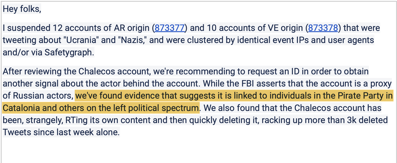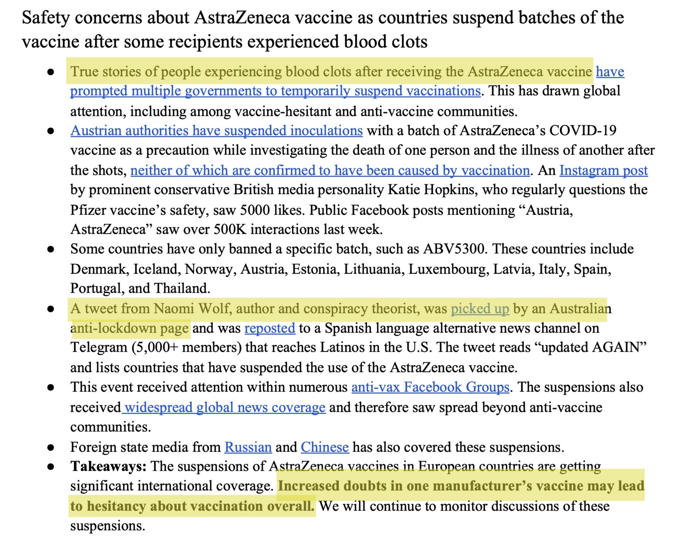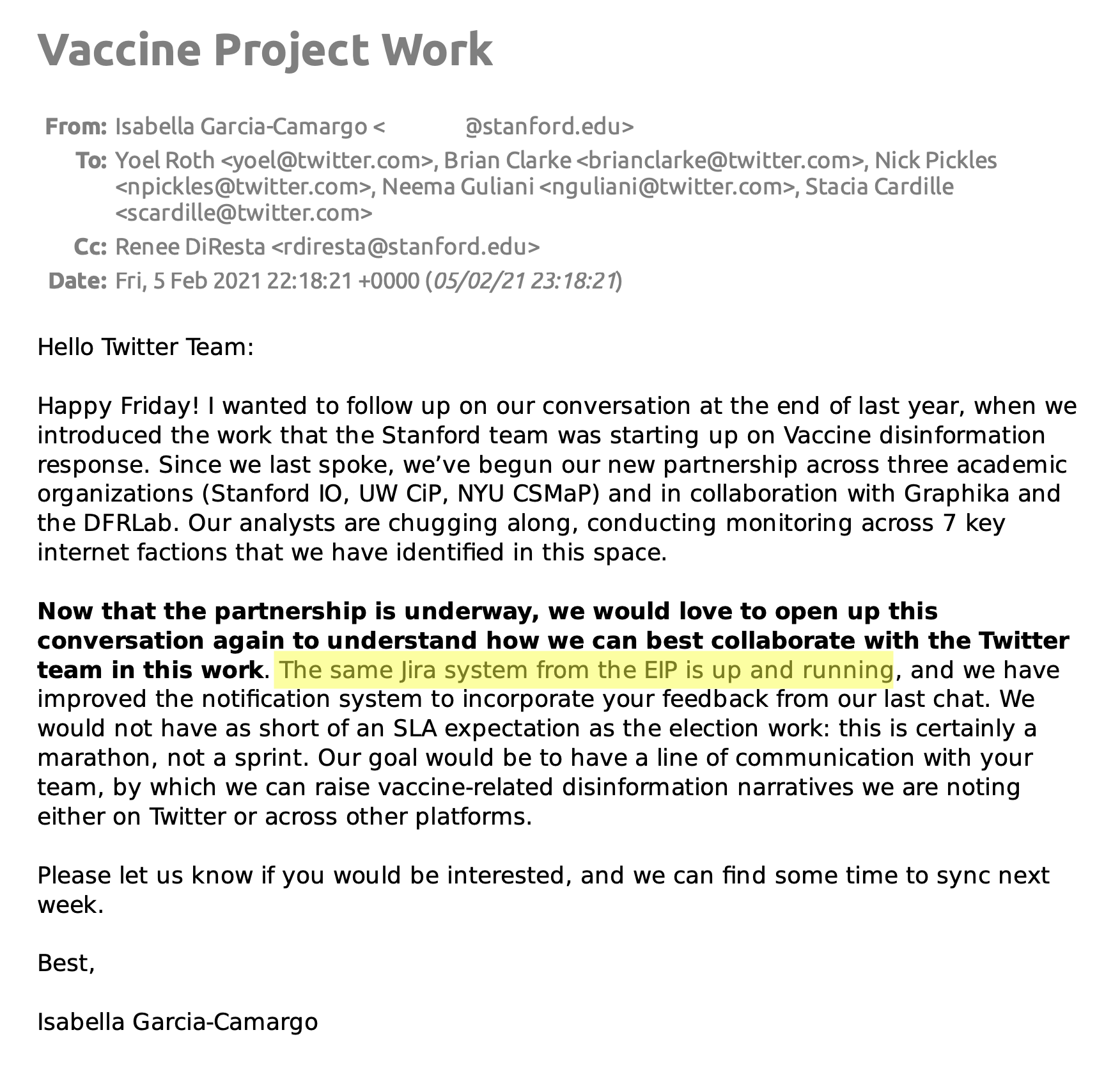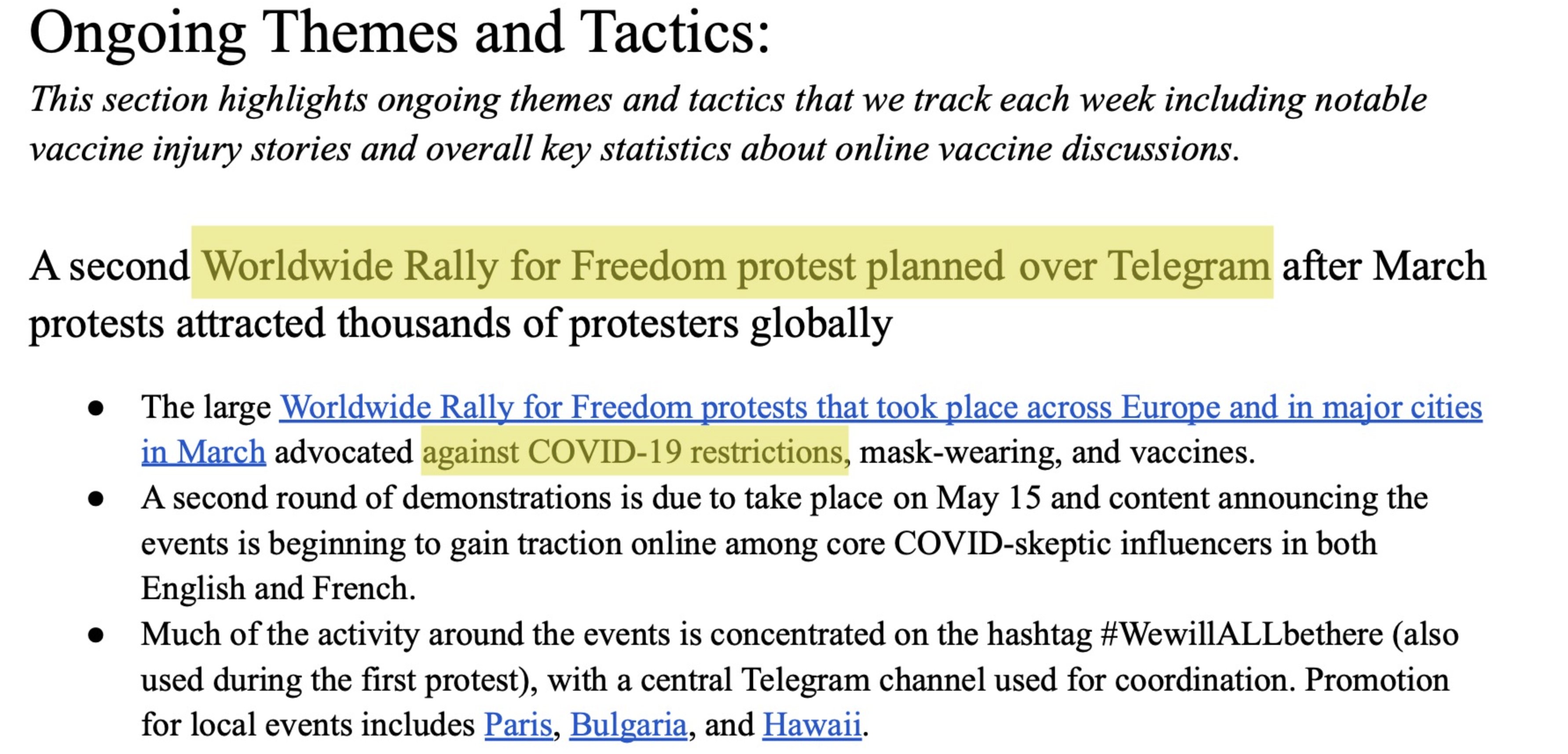 id Twitter: @FidonetRunes By ipfs.io Published On :: Sat, 25 Mar 2023 06:59:56 GMT No Context Chick Tracts (@No_Context_JTC) 2023-03-10 15:10:23 (UTC)https://twitter.com/No_Context_JTC/status/1634210093091766274Matt Taibbi (@mtaibbi) 2023-03-17 14:00:16 (UTC)https://twitter.com/mtaibbi/status/16367291666314321951.TWITTER FILES #19The Great Covid-19 Lie MachineStanford, the Virality Project, and the Censorship of “True Stories” Matt Taibbi (@mtaibbi) 2023-03-17 14:00:17 (UTC)https://twitter.com/mtaibbi/status/16367291689971097612.“The release of Dr. Anthony Fauci’s Spring 2020 emails… has been used to exacerbate distrust in Dr. Fauci.”“Increased distrust in Fauci’s expert guidance.” Matt Taibbi (@mtaibbi) 2023-03-17 14:00:18 (UTC)https://twitter.com/mtaibbi/status/16367291719959265283.“Reports of vaccinated individuals contracting Covid-19 anyway”; “natural immunity”; suggesting Covid-19 “leaked from a lab”; even “worrisome jokes”: Matt Taibbi (@mtaibbi) 2023-03-17 14:00:19 (UTC)https://twitter.com/mtaibbi/status/16367291754269655044.All were characterized as “potential violations” or disinformation “events” by the Virality Project, a sweeping, cross-platform effort to monitor billons of social media posts by Stanford University, federal agencies, and a slew of (often state-funded) NGOs.Matt Taibbi (@mtaibbi) 2023-03-17 14:00:19 (UTC)https://twitter.com/mtaibbi/status/16367291775114567705.Just before @ShellenbergerMD and I testified in the House last week, Virality Project emails were found in the #TwitterFiles describing “stories of true vaccine side effects” as actionable content. Matt Taibbi (@mtaibbi) 2023-03-17 14:00:20 (UTC)https://twitter.com/mtaibbi/status/16367291805565992986.We’ve since learned the Virality Project in 2021 worked with government to launch a pan-industry monitoring plan for Covid-related content. At least six major Internet platforms were “onboarded” to the same JIRA ticketing system, daily sending millions of items for review.Matt Taibbi (@mtaibbi) 2023-03-17 14:00:20 (UTC)https://twitter.com/mtaibbi/status/16367291827124838427.Though the Virality Project reviewed content on a mass scale for Twitter, Google/YouTube, Facebook/Instagram, Medium, TikTok, and Pinterest, it knowingly targeted true material and legitimate political opinion, while often being factually wrong itself. Matt Taibbi (@mtaibbi) 2023-03-17 14:00:21 (UTC)https://twitter.com/mtaibbi/status/16367291857071226918.This story is important for two reasons. One, as Orwellian proof-of-concept, the Virality Project was a smash success. Government, academia, and an oligopoly of would-be corporate competitors organized quickly behind a secret, unified effort to control political messaging.Matt Taibbi (@mtaibbi) 2023-03-17 14:00:21 (UTC)https://twitter.com/mtaibbi/status/16367291877162680359.Two, it accelerated the evolution of digital censorship, moving it from judging truth/untruth to a new, scarier model, openly focused on political narrative at the expense of fact.Matt Taibbi (@mtaibbi) 2023-03-17 14:00:22 (UTC)https://twitter.com/mtaibbi/status/163672919007339725210.THE BEGINNING: On February 5, 2021, just after Joe Biden took office, Stanford wrote to Twitter to discuss the Virality Project. By the 17th, Twitter agreed to join and got its first weekly report on “anti-vax disinformation,” which contained numerous true stories. Matt Taibbi (@mtaibbi) 2023-03-17 14:00:23 (UTC)https://twitter.com/mtaibbi/status/163672919248933683511. February 22, 2021: Stanford welcomed Twitter veterans like Yoel Roth and Brian Clarke, instructing them on how to join the group JIRA system. You can watch the friendly welcome video here: https://t.co/E2KfN87GlIMatt Taibbi (@mtaibbi) 2023-03-17 14:00:23 (UTC)https://twitter.com/mtaibbi/status/163672919470807449812. March 2, 2021: "We are beginning to ramp up our notification process to platforms.” In addition to the top-7 platforms, VP soon gained "visibility" to “alternative platforms such as Gab, Parler, Telegram, and Gettr” – near-total surveillance of the social media landscape. Matt Taibbi (@mtaibbi) 2023-03-17 14:00:24 (UTC)https://twitter.com/mtaibbi/status/163672919770710016213.Through July of 2020, Twitter’s internal guidance on Covid-19 required a story be “demonstrably false” or contain an “assertion of fact” to be actioned. But the Virality Project, in partnership with the CDC, pushed different standards. Matt Taibbi (@mtaibbi) 2023-03-17 14:00:24 (UTC)https://twitter.com/mtaibbi/status/163672920011045273814.VP told Twitter that “true stories that could fuel hesitancy,” including things like “celebrity deaths after vaccine” or the closure of a central NY school due to reports of post-vaccine illness, should be considered "Standard Vaccine Misinformation on Your Platform." Matt Taibbi (@mtaibbi) 2023-03-17 14:00:25 (UTC)https://twitter.com/mtaibbi/status/163672920332327321615. In one email to Twitter, VP addressed what it called the “vaccine passport narrative,” saying “concerns” over such programs “have driven a larger anti-vaccination narrative about the loss of rights and freedoms.” This was framed as a "misinformation" event. Matt Taibbi (@mtaibbi) 2023-03-17 14:00:26 (UTC)https://twitter.com/mtaibbi/status/163672920674158182416.VP routinely framed real testimonials about side effects as misinformation, from “true stories” of blood clots from AstraZeneca vaccines to a New York Times story about vaccine recipients who contracted the blood disorder thrombocytopenia. Matt Taibbi (@mtaibbi) 2023-03-17 14:00:27 (UTC)https://twitter.com/mtaibbi/status/1636729210713645056http://17.By March of 2021, Twitter personnel were aping VP language, describing "campaigns against vaccine passports," "fear of mandatory immunizations," and "misuse of official reporting tools" as "potential violations." Matt Taibbi (@mtaibbi) 2023-03-17 14:00:28 (UTC)https://twitter.com/mtaibbi/statu