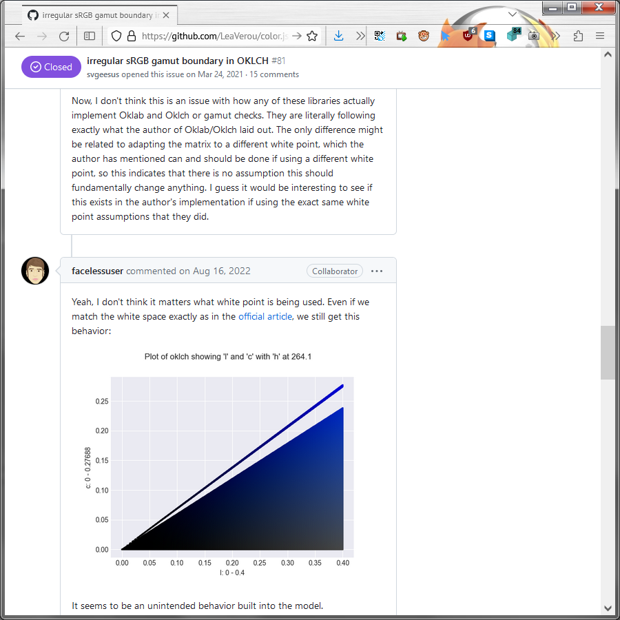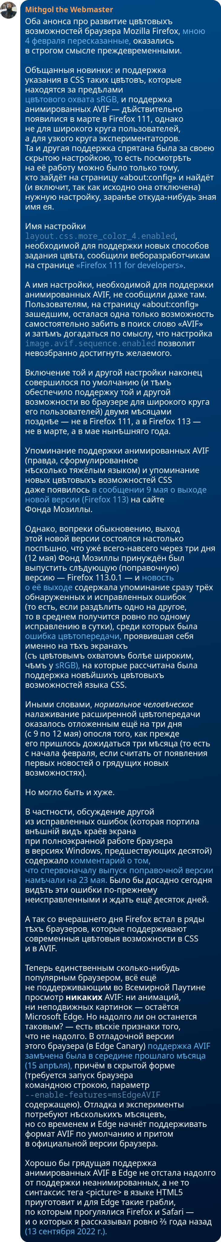 id Twitter: @FidonetRunes By ipfs.io Published On :: Wed, 28 Dec 2022 13:16:18 GMT femb✦t (@__femb0t) 2022-08-22 19:42:47 (UTC)https://twitter.com/__femb0t/status/1561801074964680705,,,,the sky above the television tuned to a dead channel was the color of a different, much older television tuned to a dead channel :( РИА Новости (@rianru) 2022-12-13 10:24:38 (UTC)https://twitter.com/rianru/status/1602610439891959811Росстандарт принял ограничивающий скорость электросамокатов до 25 км/ч ГОСТhttps://ria.ru/20221213/skorost-1838302599.html Mithgol the Webmaster (@FidonetRunes) 2022-12-14 05:58:01 (UTC)https://twitter.com/FidonetRunes/status/1602905729089904640[53:1] Начну новый #твитшторм и соберу свѣдѣнія и мои разсужденія про цвѣта и цвѣтовыя пространства, про цвѣтовые профили, про нюансы отображения цвѣтовъ различными экранами и девайсами, различными браузерами и другими приложениями, как быть пользователям, как быть разработчикам.Mithgol the Webmaster (@FidonetRunes) 2022-12-14 05:58:03 (UTC)https://twitter.com/FidonetRunes/status/1602905737872789505[53:2] Для начала напомню, что сорок дней назад (4 ноября) в сообщениях https://twitter.com/FidonetRunes/status/1588511088089661441 и https://twitter.com/FidonetRunes/status/1588526911915196416 собирал нѣкоторыя свѣдѣнія о цвѣтовомъ пространстве Adobe RGB (1998) и пришёл к выводу, что уходить в него из sRGB мнѣ неохота (точности 24 бит недостаточно). Mithgol the Webmaster (@FidonetRunes) 2022-12-14 05:58:05 (UTC)https://twitter.com/FidonetRunes/status/1602905746802352129[53:3] Дюжиною дней позже (16 ноября) я досадовал по адресу https://twitter.com/FidonetRunes/status/1592657131630493696 о том, что Firefox не поддерживал профили ICCv4 и оттого не мог вѣрно показать итог изощрённого сжатия JPEG в пространстве XYB.Вчера (13 декабря) вышел Firefox 108, наконец поддерживающий ICCv4. Mithgol the Webmaster (@FidonetRunes) 2022-12-14 05:58:07 (UTC)https://twitter.com/FidonetRunes/status/1602905756587753472[53:4] Новость https://www.mozilla.org/en-US/firefox/108.0/releasenotes/ про появление ICCv4 во браузере Firefox можно провѣрить собственноручно, зайдя в Firefox 108 на страницу https://www.color.org/version4html.xalter и видя его показывающим провѣрочное изображение (составленное из 4 кусков с разными профилями цвѣта) безупречно. Mithgol the Webmaster (@FidonetRunes) 2022-12-14 07:25:33 (UTC)https://twitter.com/FidonetRunes/status/1602927760091254785[53:5] Ну а 29 ноября я пощупал цвѣтоподборщикъ https://oklch.evilmartians.io/ (который @andrey_sitnik и @romanshamin сдѣлали) и говорил о моих цвѣтовыхъ впечатлениях без мáлого 2⅕ часа кряду (предисловие https://t.me/ReadMithgol/547 и таймкоды видеозаписи https://t.me/ReadMithgol/548 прилагаю). Mithgol the Webmaster (@FidonetRunes) 2022-12-14 09:59:28 (UTC)https://twitter.com/FidonetRunes/status/1602966493834215425Насчёт https://twitter.com/FidonetRunes/status/1587046309424517128 по адресу https://news.ycombinator.com/item?id=33936614 вижу интересное истолкование мрачной судьбы JPEG XL: раз даже ИЗНУТРИ GOOGLE не достичь поддержки нового формата файлов, то гибель в 2014 году идеи о браузеронезависимой (плагинной) поддержке форматов погубит и WWW. Brodie Robertson (@BrodieOnLinux) 2022-12-13 20:05:00 (UTC)https://twitter.com/BrodieOnLinux/status/1602756493069238272Chromium Ends JPEG XL Before It Even Lived #Linux #YouTube https://youtu.be/Jyk87VVfh9s Jon Sneyers (@jonsneyers) 2022-12-14 14:06:33 (UTC)https://twitter.com/jonsneyers/status/1603028676278423554Contemplating Codec ComparisonsHere are my thoughts on the recent codec comparison by Google's AVIF team, that led to Chrome's decision to remove JPEG XL.https://cloudinary.com/blog/contemplating-codec-comparisonsJon Sneyers (@jonsneyers) 2022-12-14 15:15:38 (UTC)https://twitter.com/jonsneyers/status/1603046060842258433Main points:- Decoding time of avif and jxl is now about the same- UX for jxl is better (thanks to streaming decode and progressive rendering)- Measuring speed correctly, avif is slower to encodeJon Sneyers (@jonsneyers) 2022-12-14 15:18:14 (UTC)https://twitter.com/jonsneyers/status/1603046713287131137- Measuring quality in the relevant fidelity region ('web quality'), jxl is ~15% better than avif according to the data from the avif team- For lossless, jxl advantages are more substantial than what the avif team comparison suggests- Format features have to be considered tooJon Sneyers (@jonsneyers) 2022-12-14 15:21:12 (UTC)https://twitter.com/jonsneyers/status/1603047459218931712Basically the blog post explains how the AVIF team's comparison data ended up getting misinterpreted, while it does actually show the value of JPEG XL.Jon Sneyers (@jonsneyers) 2022-12-14 16:01:16 (UTC)https://twitter.com/jonsneyers/status/1603057543277846528For example, this plot (provided by the AVIF team) shows that JXL is 17% better than AVIF at 1 bpp, which is the 