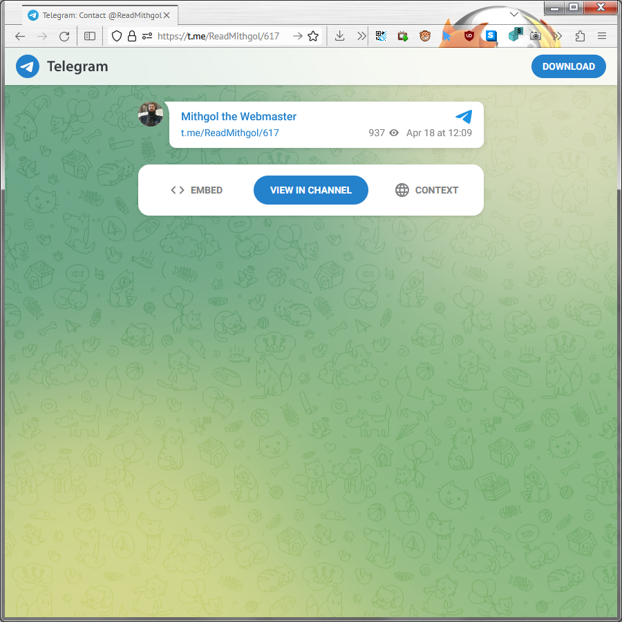 id Twitter: @FidonetRunes By ipfs.io Published On :: Mon, 20 Feb 2023 11:44:36 GMT Andy V (@steppentiger) 2023-02-04 23:02:00 (UTC)https://twitter.com/steppentiger/status/1622007595744591873Доброй ночи. libp2p (@libp2p) 2023-02-08 19:11:51 (UTC)https://twitter.com/libp2p/status/1623399225256996871We're excited to share that #WebRTC browser-to-server is integrated into multiple #libp2p implementations! ????The libp2p browser connectivity story gets stronger ????Read all about it in our new blog post: https://blog.libp2p.io/libp2p-webrtc-browser-to-server/ Twitter (@Twitter) 2023-02-08 20:00:46 (UTC)https://twitter.com/Twitter/status/1623411536243965954more words more words more words more words more words more words more words more words more words more words more words more words more words more words more words more words more words more words more words more words more words more words more words more words more words more… https://twitter.com/i/web/status/1623411536243965954Edward Snowden (@Snowden) 2023-02-09 00:37:22 (UTC)https://twitter.com/Snowden/status/1623481143457611776The whole system revolves around the idea that the majority can be made to believe ????????????????????????????????, so long as it is repeated loudly and often. And it works.Алексей Кошин (@Convoker) 2023-02-08 16:54:20 (UTC)https://twitter.com/Convoker/status/1623364619745038341Выходишь вечером в магаз@Погода обычная Питерская@Мокрая жижа поверх льда примерно как на катке@Кое как доковыливаешь до пешеходного перехода@В это время из сугроба выпрыгивает чел на моноколесе, с рюкзаком, с фонариком в одной руке и пачкой туалетной бумаги в другой...Алексей Кошин (@Convoker) 2023-02-08 17:02:27 (UTC)https://twitter.com/Convoker/status/1623366662098456595Как ни в чем не бывало, с покерфейсом на лице, наворачивает на этом ледяном пятачке смерти для двуногих 2-3 ровненьких кругаля, по рельсам прямо как Ту-214СР@По зелёному свету уходит в горизонт@Вспоминаешь того самого персонажа робота на колесе...Max Grishin (@GrishinMax) 2023-02-09 03:06:25 (UTC)https://twitter.com/GrishinMax/status/1623518655358111747@Convoker Алексей Кошин (@Convoker) 2023-02-09 03:41:57 (UTC)https://twitter.com/Convoker/status/1623527596569903106@GrishinMax Да-да, но прикол в том что у него руки были заняты ????Jon Sneyers (@jonsneyers) 2023-02-08 12:03:22 (UTC)https://twitter.com/jonsneyers/status/1623291394268753922Now Chrome 110 became stable and jxl support is gone, I am switching to Thorium. It's basically the same as Chrome, just faster and better. I should have switched earlier! https://thorium.rocks/X Æ A-12 (@ray5ar) 2023-02-08 12:21:46 (UTC)https://twitter.com/ray5ar/status/1623296023614332930@jonsneyers What is about their jpegXL support?Jon Sneyers (@jonsneyers) 2023-02-08 13:21:22 (UTC)https://twitter.com/jonsneyers/status/1623311023477235713@ray5ar Thorium supports JPEG XL by default (not behind a flag) and will keep it like that also now upstream chromium removed it. Thorium is afaik the fifth browser to enable jxl by default (after Pale Moon, Basilisk, Waterfox and LibreWolf) and the first one that is chromium-based.Andy V (@steppentiger) 2023-02-09 06:59:25 (UTC)https://twitter.com/steppentiger/status/1623577293124763648Доброго времени суток. animals going goblin mode (@mischiefanimals) 2022-11-10 21:38:36 (UTC)https://twitter.com/mischiefanimals/status/1590821250720739330(video)animals going goblin mode (@mischiefanimals) 2023-02-08 23:04:05 (UTC)https://twitter.com/mischiefanimals/status/1623457670052315137(video)animals going goblin mode (@mischiefanimals) 2022-08-07 14:13:30 (UTC)https://twitter.com/mischiefanimals/status/1556282389768331268(video)Vladislav (@zd_vladislav) 2023-02-09 14:25:00 (UTC)https://twitter.com/zd_vladislav/status/1623689427649167361Дорогая Медуза!Ответ на ваш вопрос очень прост: либералы просто наплевали на цитату из Википедии, которую вы привели, и сами превратили это слово в ругательство.Либералы во всём мире выступают за "правильные" репрессии за слова, за "правильное" государственное принуждение. Gudim (@like_gudim) 2023-02-09 15:53:59 (UTC)https://twitter.com/like_gudim/status/1623711819629043723Andy V (@steppentiger) 2023-02-10 06:15:03 (UTC)https://twitter.com/steppentiger/status/1623928511915503623Один актив сломал, второй потерял. myceera (@myceera) 2023-02-10 09:24:50 (UTC)https://twitter.com/myceera/status/1623976272958263298Какой неудачный пример перераспределния пространства улицы в пользу устойчивых видов транспорта.Узкая выделенка, незащищенная велодорожка, совмещение вело и автобусов, перпендикулярная парковка без буфера. РосКомСвобода (@RuBlackListNET) 2023-02-10 09:07:08 (UTC)https://twitter.com/RuBlackListNET/status/1623971820633264129ФСБ призвала к бдительностиhttps://t.co/p1ab2PrQxe Mithgol the Webmaster (@FidonetRunes) 2023-02-12 01:16:01 (UTC)https://twitter.com/FidonetRunes/status/1624578037126770690@LucaVersari3 I've noticed that your https://t.co/GTFX0nbxlF does not seem to contain any brotli*.dll recen