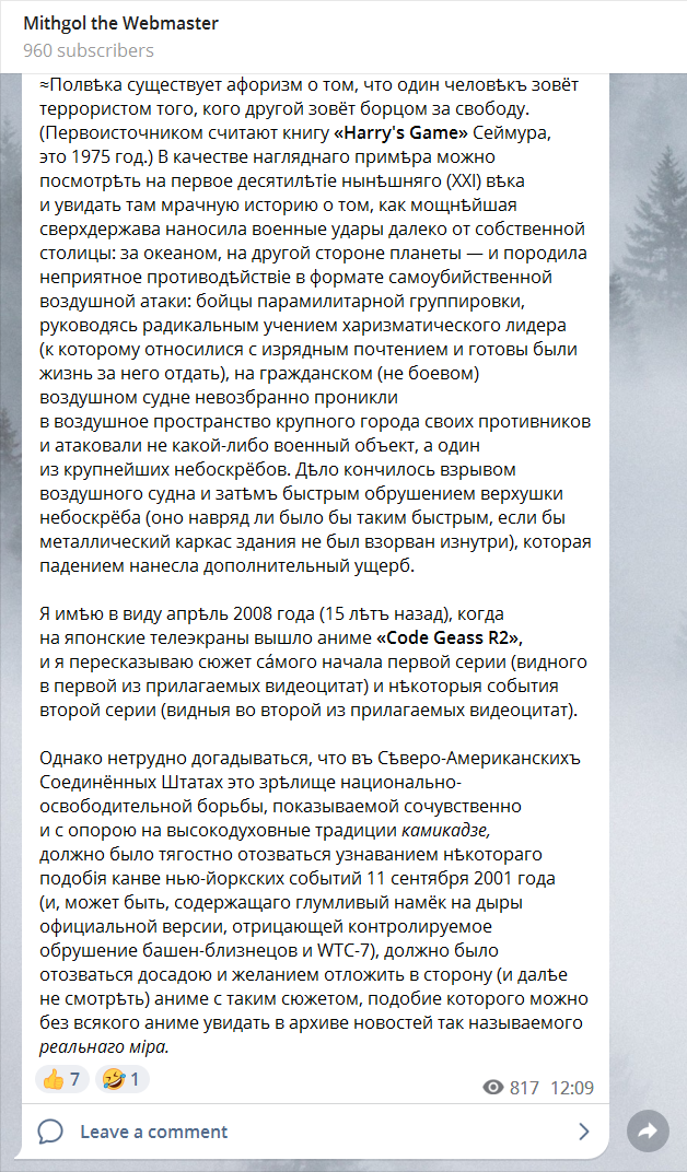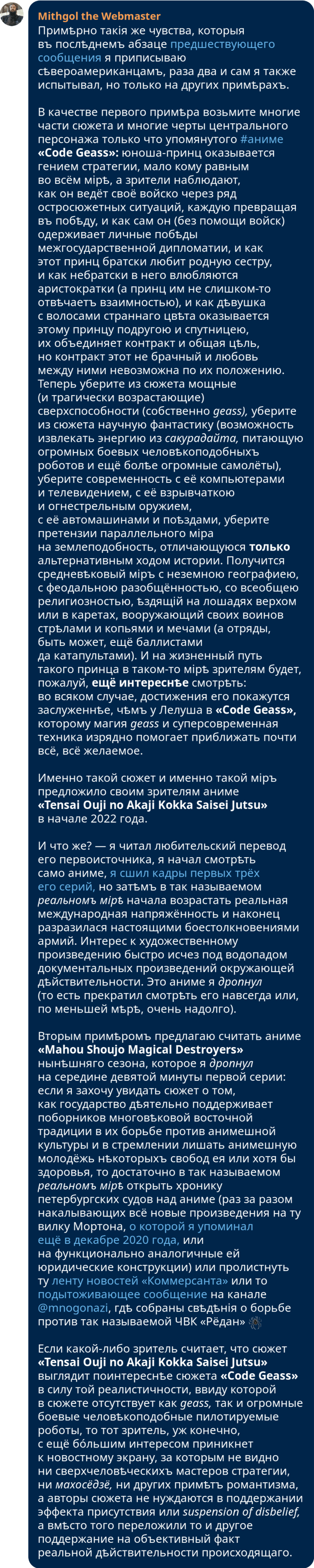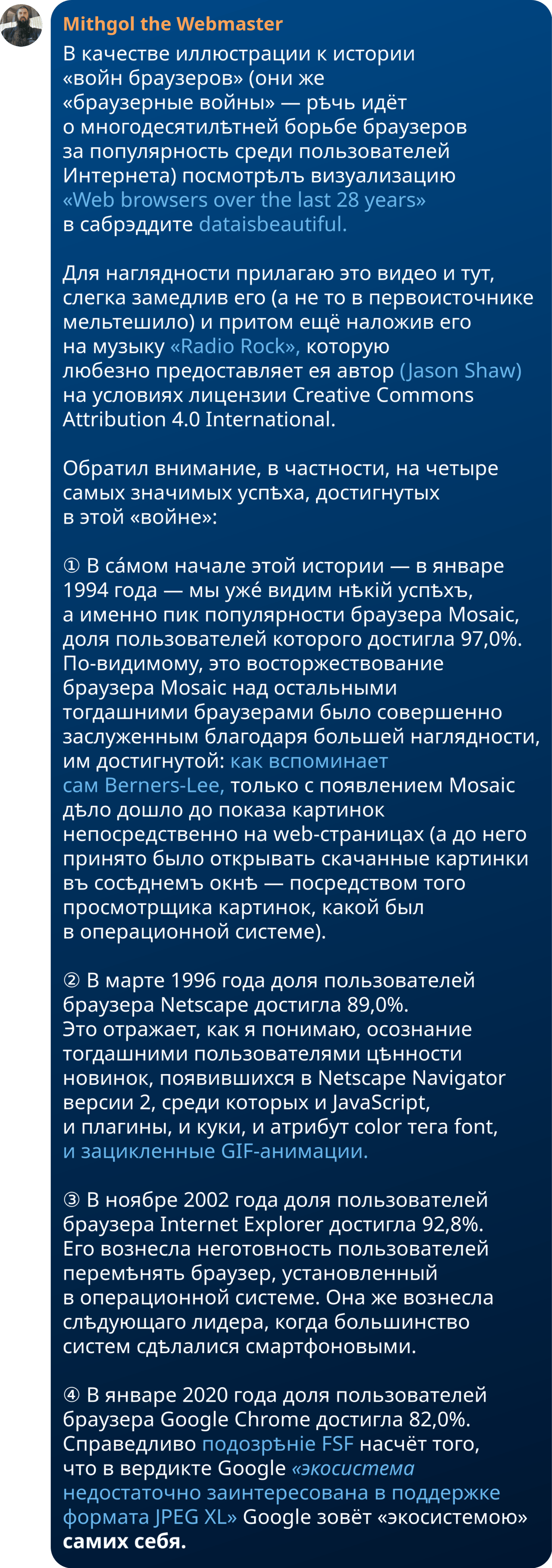 id Twitter: @FidonetRunes By ipfs.io Published On :: Tue, 09 May 2023 13:31:22 GMT дольче кубана (@t_nechist) 2023-04-17 16:40:11 (UTC)https://twitter.com/t_nechist/status/1648003430940549127Если в полдень казачка не толчет в ступе кофейные зерна, то уже что-то не так с финансами в семье ???? badhbh (@orichalchi) 2023-04-17 16:59:03 (UTC)https://twitter.com/orichalchi/status/1648008180541054976@t_nechist Неожиданно...дольче кубана (@t_nechist) 2023-04-17 17:23:34 (UTC)https://twitter.com/t_nechist/status/1648014350819401756@orichalchi снова факты о казаках, которые вы не знали и, честно говоря, не хотели знатьTechnophobia.org (@TechnophobiaOrg) 2023-04-18 19:28:21 (UTC)https://twitter.com/TechnophobiaOrg/status/16484081413888245761.5 million Indians die each year of smoking.E-cigarettes are outlawed. Cigarettes are legal. https://www.bbc.co.uk/news/world-asia-india-49738381Charles A. Gardner, PhD (@ChaunceyGardner) 2023-04-18 20:35:17 (UTC)https://twitter.com/ChaunceyGardner/status/1648424986896642050@TechnophobiaOrg India adopted nicotine vape prohibition under pressure from @WHO. The WHO's tobacco control efforts are funded by US billionaire @MikeBloomberg. Mike is a #HarmReduction denier.I'm sure protecting sales of gov't-owned ITC Ltd.'s deadly cigarettes had nothing to do with it.Anna Prosvetova (@meowkoteeq) 2023-04-18 22:26:42 (UTC)https://twitter.com/meowkoteeq/status/1648453025051312132why the fuck is madoka magica rebellion so confusing? i was pissed and frustrated when i watched it the first time bc most of it was just flashing visuals and confusing plot twists. a week of fandom wiki research afterwards helped me enjoy the story 2 years ago, but I FORGOT ITAnna Prosvetova (@meowkoteeq) 2023-04-18 22:26:43 (UTC)https://twitter.com/meowkoteeq/status/1648453028427743232i just remembered that i LOVED the anime, and i was SO HYPED to rewatch it today, and then… all the confusion and frustration CAME BACK. this is not how i wanna remember madoka, so i have to research all of it again! and you know what? i don’t have time for that ????Anna Prosvetova (@meowkoteeq) 2023-04-18 22:29:09 (UTC)https://twitter.com/meowkoteeq/status/1648453640691277829(i will probably calm down by the morning and dive into wikis anyway, because madoka is a masterpiece and doesn’t deserve to be associated with frustration :/)Mithgol the Webmaster (@FidonetRunes) 2023-04-19 07:03:07 (UTC)https://twitter.com/FidonetRunes/status/1648582985116008450@meowkoteeq …do you know that “Rebellion” is meant to be a sequel to the original TV series “Puella Magi Madoka Magica” and have you seen those series?Anna Prosvetova (@meowkoteeq) 2023-04-19 08:06:18 (UTC)https://twitter.com/meowkoteeq/status/1648598887261675520@FidonetRunes oh of course! i rewatched the series too without any issues. the first watch in 2021 wasn’t that smooth, and i also needed extra explanations back then, but just once xDAl Dragon (@aldragon_net) 2023-04-19 17:56:50 (UTC)https://twitter.com/aldragon_net/status/1648747498045857804— ...твой цвет — белый.— Мне надо идти вперёд, до самой последней клетки?— Нет, Алиса, просто стой тут, не двигайся, жди, чем всё закончится. На этой доске играют в го.Al Dragon (@aldragon_net) 2023-04-19 17:58:18 (UTC)https://twitter.com/aldragon_net/status/1648747865399754753— И скажи спасибо, что не в реверси. Очень утомительно трижды менять цвет ещё до завтрака только потому, что что-то где-то произошло.Λύşşα (@IGodOfMadness) 2023-04-18 04:22:38 (UTC)https://twitter.com/IGodOfMadness/status/1648180208925548547Чуваки, которые ездят по городу на моноколесе во всём этом обмудировании и под музыку из будущего, спасибо за хорошее настроениеJyrki Alakuijala ???????? (@jyzg) 2023-04-19 08:03:40 (UTC)https://twitter.com/jyzg/status/1648598225081753602jpegli encoder is ready for first server side deployments.https://github.com/libjxl/libjxl/tree/main/lib/jpegliIt is like mozjpeg but compresses 20-25% more in medium to high quality, and allows HDR.Decoder also works but dark corners of libjpeg ABI compatibility require about three months more work.Meow (@meowtw) 2023-04-18 04:38:08 (UTC)https://twitter.com/meowtw/status/1648184108999380992Hilarious to see that Ars Technica spelt #AVIF as "AV1F"!https://t.co/YKWfM9SbibNina ???? Byzantina (@NinaByzantina) 2023-04-20 16:48:03 (UTC)https://twitter.com/NinaByzantina/status/1649092574949556225Relaxing in a skyscraper pool in Yekaterinburg, Russia looks like this: (video)Able Archer (@AbleArcher88) 2023-04-21 06:55:07 (UTC)https://twitter.com/AbleArcher88/status/1649305748587835393Как быстро все забыли про кротовуху, ЧВК Редан и ивана солярного. Sic transit gloria mundi!Andy V (@steppentiger) 2023-04-21 06:58:42 (UTC)https://twitter.com/steppentiger/status/1649306650094850050Напиток кротовухаЗабыт давным-давно,А был он слаще меда,Пьянее, чем вино. https://twitter.com/AbleArcher88/status/1649305748587835393Mithgol the Webmaster (@FidonetRunes) 2023-04-21 16:14:57 (UTC)https://twitter.com/FidonetRunes/status/1649446636014260225@steppentiger и содержал говноAndy V (@steppentiger) 2023-04-21 07:01:20 (UTC)https://twitter.com/steppentiger/status/1649307311456890880Написал тут про русского Синдбада-морехода. Wes Bos (@wesbos) 2023-04-19 16:18:56 (UTC)https://twitter.com/wesbos/status/1648722862717521923