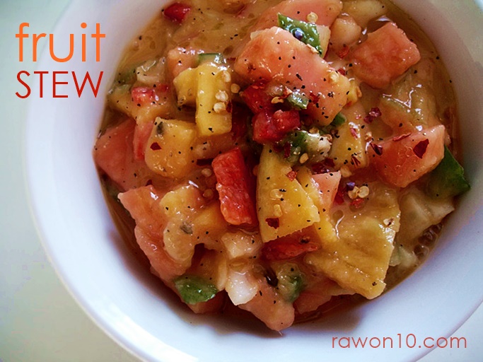 food Fruit Stew: Raw Food Recipe By rawon10.blogspot.com Published On :: Wed, 13 Apr 2016 17:22:00 +0000 Fruit Stewserves 2 ~ $2.48 per serving This is surprisingly filling. You can make this entirely fat free by simply omitting the olive oil, which is something I do on occasion. ingredients1 mango, cubed ($1.49)1 papaya, cubed ($.99)1 cucumber, chopped ($.69)2 tablespoons olive oil ($.20)1 teaspoon salt1 medium onion, finely chopped ($.05)1 red bell pepper, finely chopped ($.89)1 jalapeno, minced ($.20)2 tablespoons lime juice ($.45) black pepper red pepper flakesdirectionsIn a food processor fitted with an "S blade, puree about a third of each of the mango, papaya, and cucumber and the olive oil and salt until very smooth. This is the stew base. In a large bowl, add the remaining chopped mango, papaya, and cucumber, along with the onion, red bell pepper, and jalapeno. Stir to mix. Add the lime juice and stir again. Serve with a bit of black pepper and a few crushed red pepper flakes.Most of the heat of a jalapeno is found in the seeds. I like this kind of spicy so I include most of the seeds from the jalapeno. If you prefer a bit more mild taste, just leave out most or all of the seeds. nutritional information calories: 289 fat: 14 gr carbs: 43 gr protein: 3 gr And want to know a few fun facts about fruit, too?Hope you're all having a great spring! Say hello :) Full Article