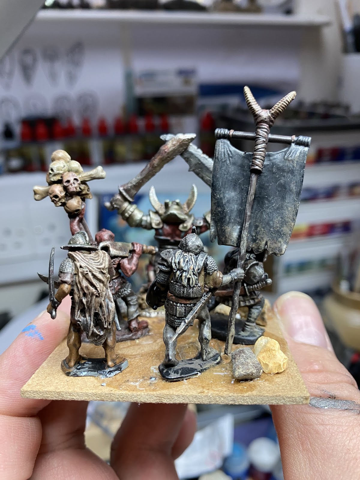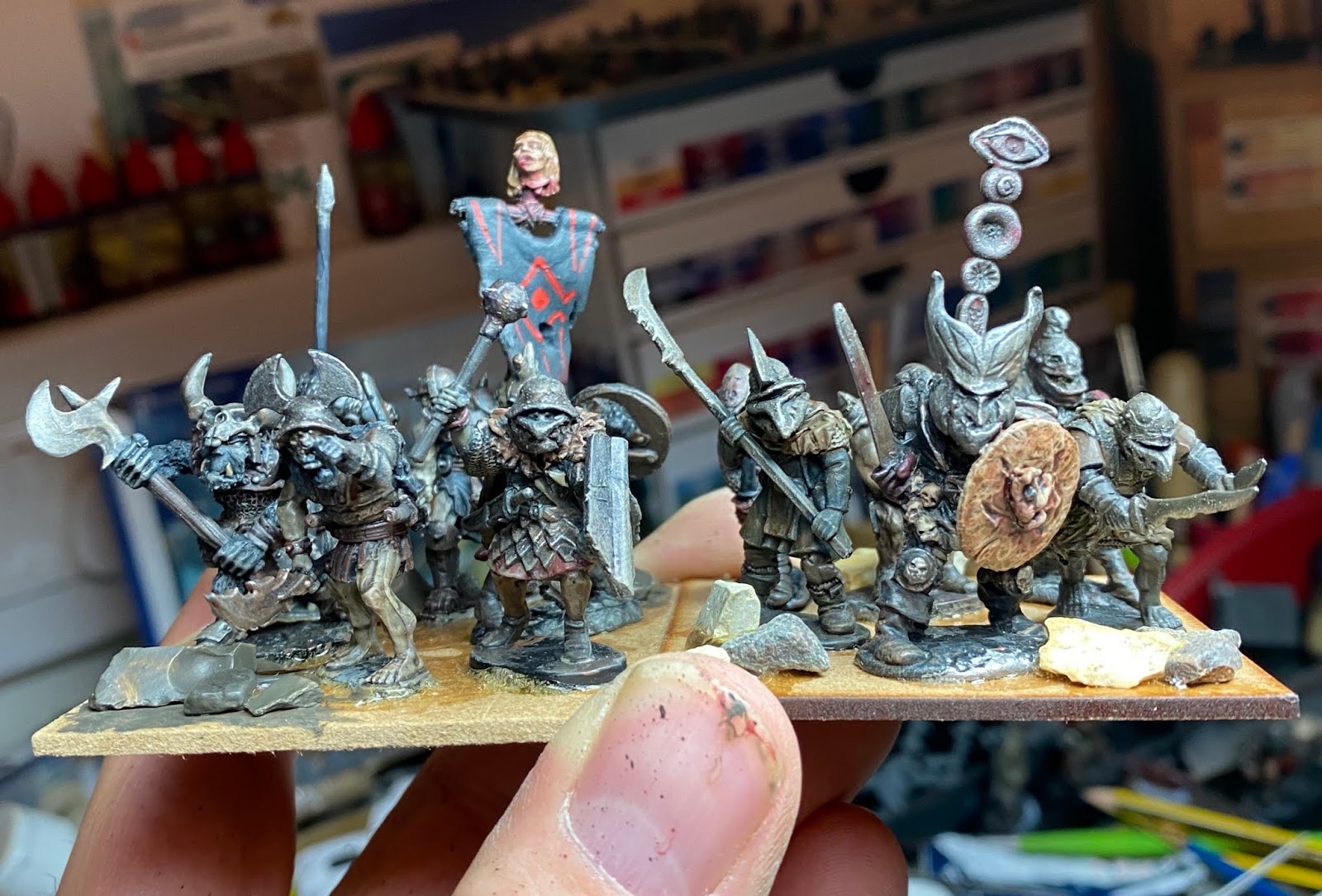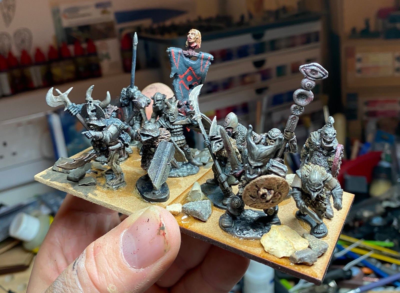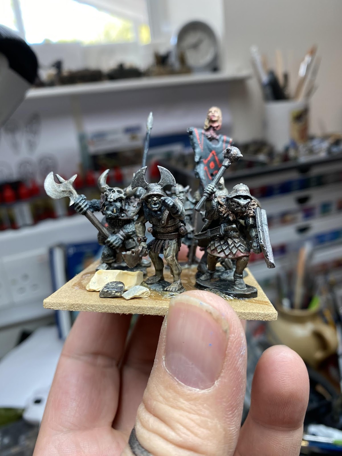 base Orc Command Bases By iron-mitten.blogspot.com Published On :: Sat, 02 May 2020 13:16:00 +0000 I do enjoy painting orcs, it is so enjoyable and freeing after painting hundreds of identical uniforms. These bases had an extra level of enjoyment because they contained many orcy helmets converted with green stuff. I think in the whole they turned okay and add to the hodge podge look of the units. I had planned to spread these helmet guys out but ended up using them all on these two bases, they were finished and ready to go when I needed them, so they were used.This giant orc Warlord is from Reaper Miniatures. He is massive and so he counts as two orcs in one. My six to a base rule works out as if they are small Goblins, they get an extra figure or two. If they are giant warriors, well then they get one less. This is to keep the fighting value of the base the same visually.Plastic Warlord Games orcs with green stuff heads and an old plastic GW banner bring up the rear. Also on this base is the classic standard bearer for Harboth’s Black mountain boys. Classic! No point hanging onto these precious opp models, get them painted and use them I say.It appears my years in Art college weren’t wasted after all. Subconsciously when basing these brutes, I arranged them in such a way that the surrounding orcs weapons help guide your eye on to the leader of the piece. Twenty five years later I finally got it right...Plastic axes were stuck on the leader’s helmet to give him a kind of orcy centurion look. This is influenced by the films I have to say and has a nice brutal look to it.The Elf head on the standard was a nice find, however the pole was really thin and bendy. I reenforced this by adding a green stuff banner which really helped. I tore holes in it and made it look very tattered and the result was very pleasing.The orc above with the mace was made from a Fire forge Sergeant’s body, oathmark goblin arms, warlord games orc head and green stuff mask. He also has a plastic cloak from somewhere too. A real jumble of bits and pieces. I think here lies the real fun of this project, using parts to create unique figures. It’s very rewarding and I have to say becomes very addictive, in fact once you start it’s hard to stop.A new base now and this one is lead by a very old sculpt indeed. I think it is an old ‘Perry’ Chaos warrior. Well, an orc who is a Chaos warrior at any rate. I always try to theme my bases slightly and they are always influenced by the leader. This oop figure needed some old friends to keep him company, so I found some other old Citadel miniatures for the base. Saying that, his two closest warriors are more kit bashed plastics with green stuff helmets. New meets very old.Orcy spears and pole arms can be made by cutting off spears and sticking on naggaity goblin swords. Obviously this works better with plastics and plastic glue. I have found that once the glue has melted the two bits together the weapons are quite durable. The spear shaft will bend rather than the sword break off.Again the arrangement of positions helps to draw your eye into the centre of the piece. I surprise myself with this arty bullsh@t.TIPS.The motley crew. Earth brown paint was stippled over these guys to give them a real dirty look. Lots of brown washes of various shades, green washes, black washes, in fact just go crazy with colour washes, you can’t really go wrong. Once a fine metal dry brush goes over the top, it all looks good and gives the armour a grungy look. Flesh wash is good for rusty armour so put patches of that here and there. If you have any bronze looking armour or shields, try some green wash on that too. Mix washes together to make the grungiest washes. I have a pot labelled ‘magic mix’ where I have mixed black with brown ink, this is great for orc skin, armour, weapons... well everything really. Just slap it on all over. It even smells bad because the tap water used in the mix has gone off, every time you open the orc shading pot... you get the orc!.Give the kit bashing a go, it’s great fun and you will create something unique. Just because you have bought a plastic box set, don’t be scared to mix it up with another of a different make. Single sprues of Dark Age/medieval plastics can be bought on eBay for under a fiver. I use these to try and test things out, if I really like the results I will commit to buying a whole box. Plastics are a lot cheaper than lead so there is room to buy and try out different options without busting the purse strings..Create me an army worthy of Mordor! Full Article Dragon Rampant lord Of The Rings