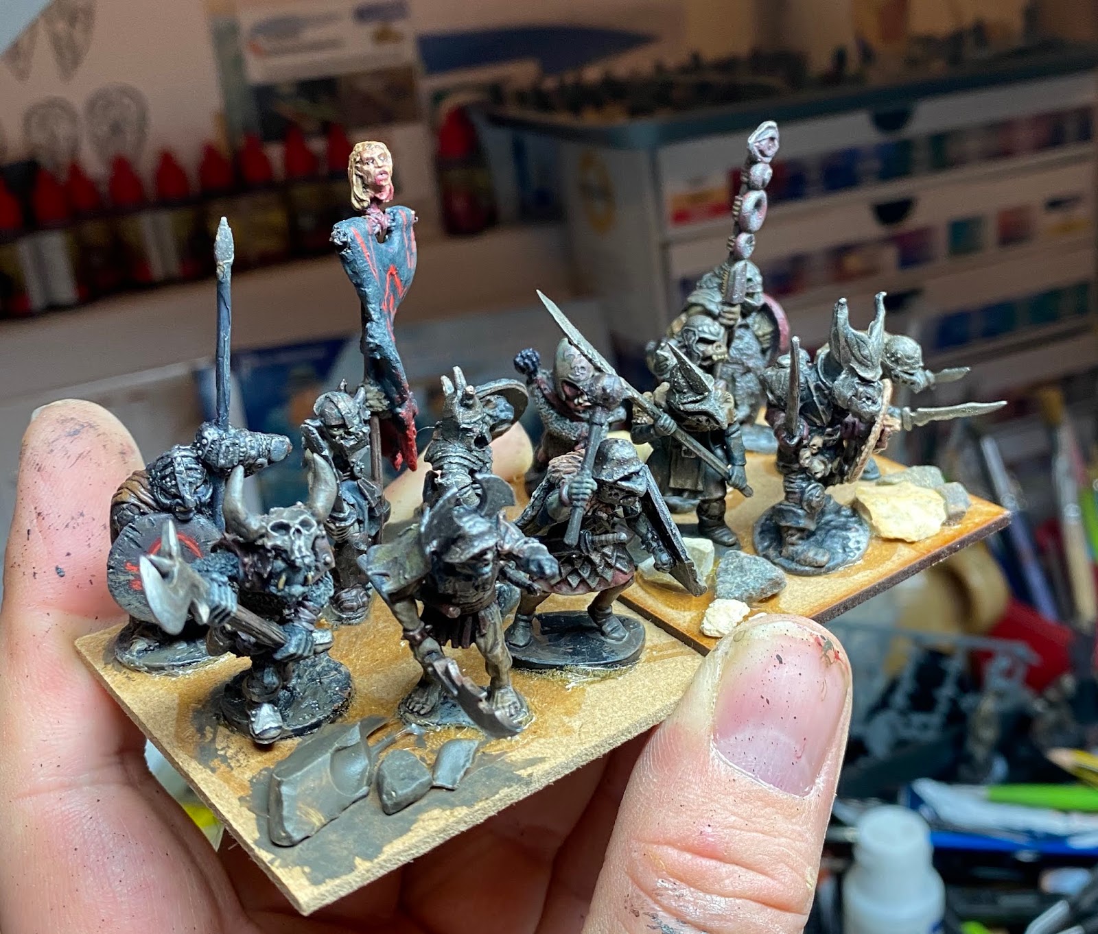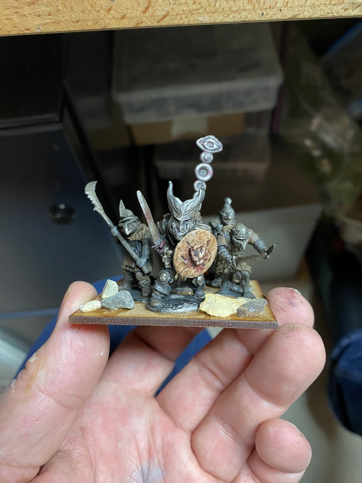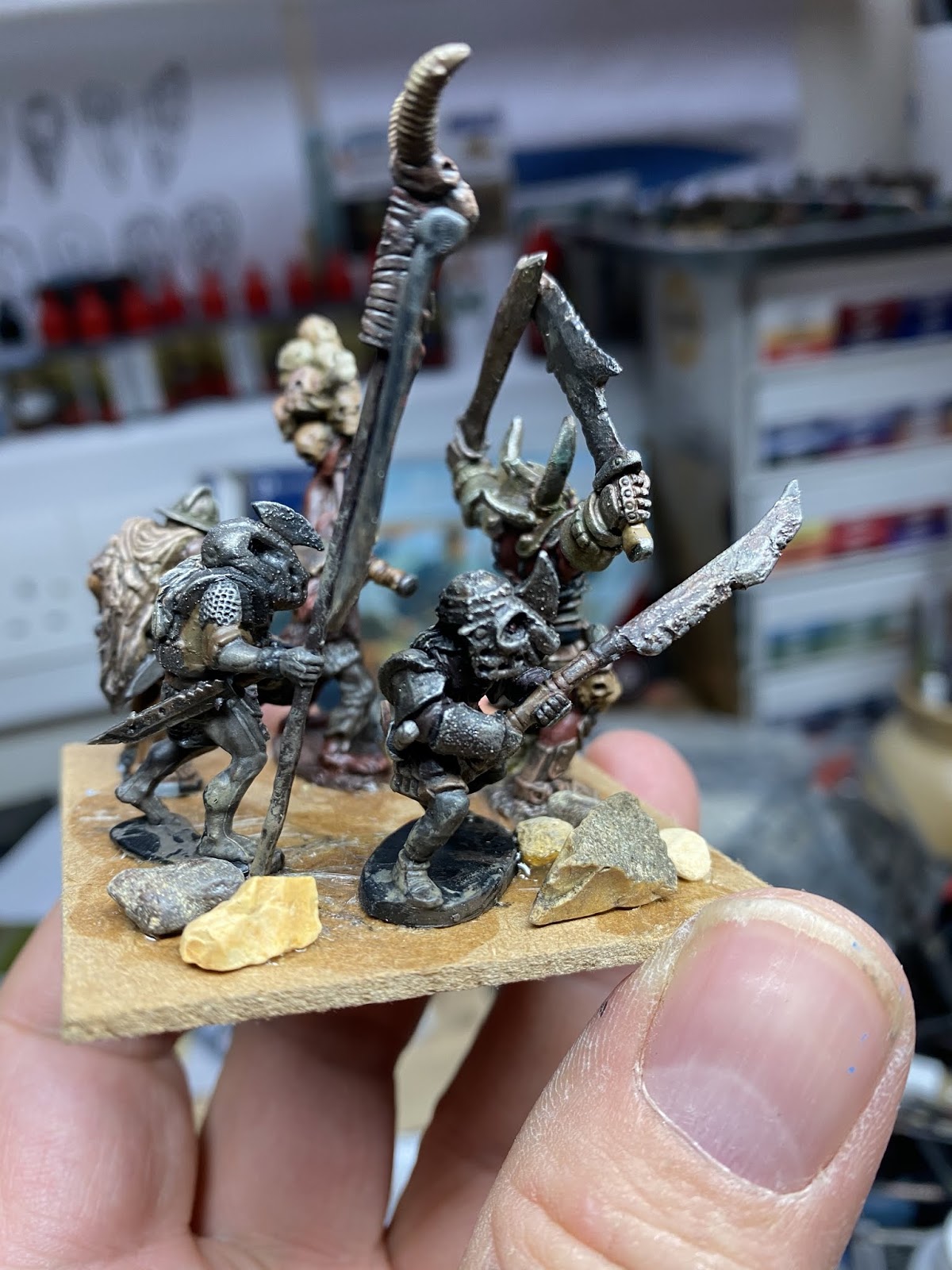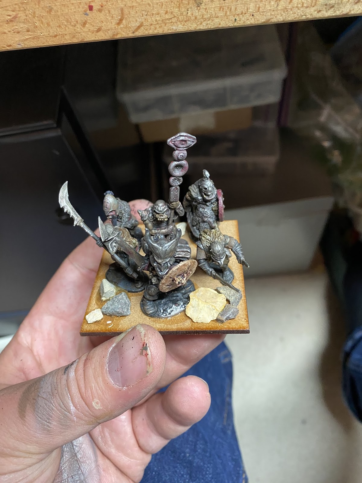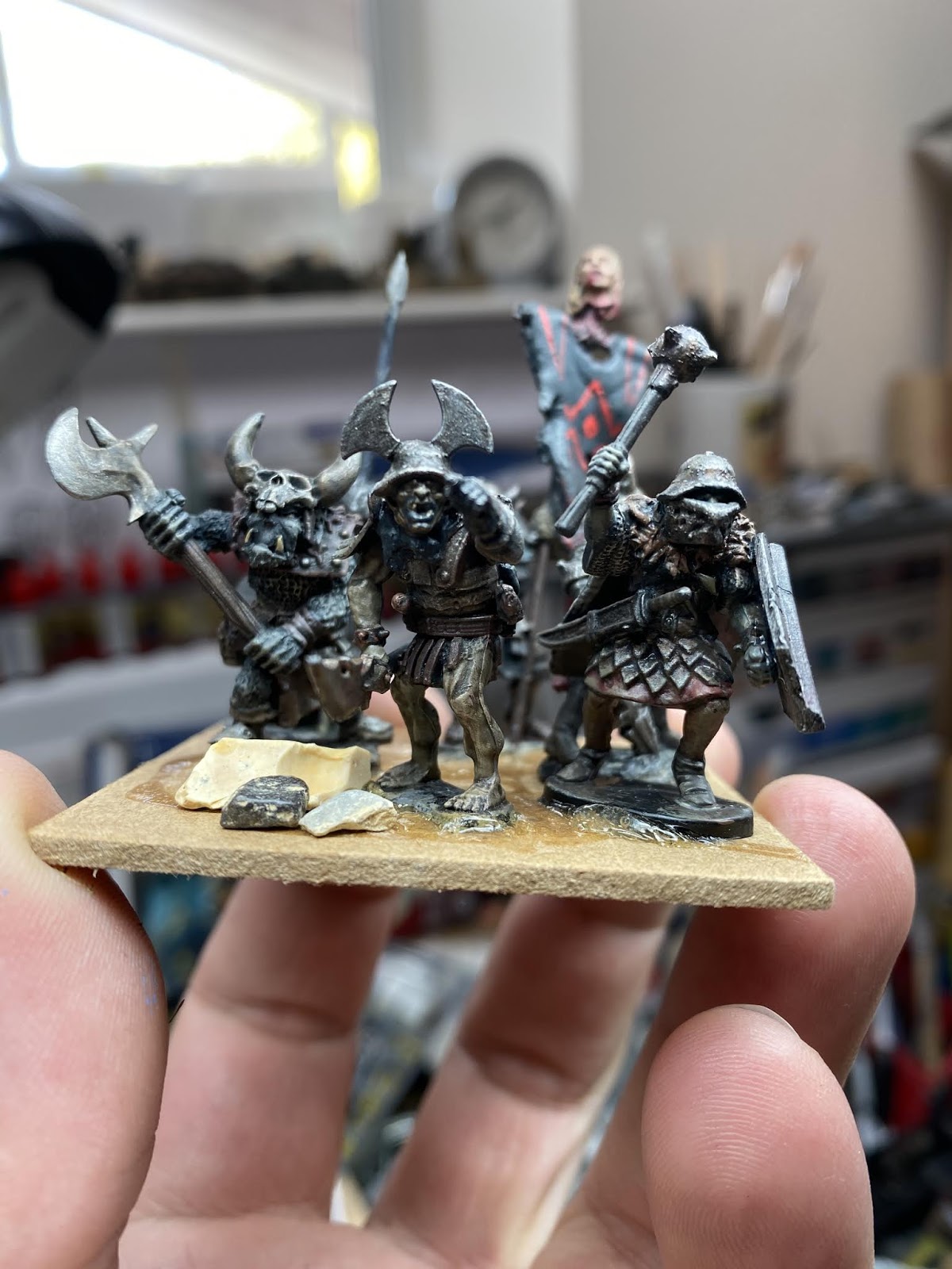 base Orc Command Bases By iron-mitten.blogspot.com Published On :: Sat, 02 May 2020 13:16:00 +0000 I do enjoy painting orcs, it is so enjoyable and freeing after painting hundreds of identical uniforms. These bases had an extra level of enjoyment because they contained many orcy helmets converted with green stuff. I think in the whole they turned okay and add to the hodge podge look of the units. I had planned to spread these helmet guys out but ended up using them all on these two bases, they were finished and ready to go when I needed them, so they were used.This giant orc Warlord is from Reaper Miniatures. He is massive and so he counts as two orcs in one. My six to a base rule works out as if they are small Goblins, they get an extra figure or two. If they are giant warriors, well then they get one less. This is to keep the fighting value of the base the same visually.Plastic Warlord Games orcs with green stuff heads and an old plastic GW banner bring up the rear. Also on this base is the classic standard bearer for Harboth’s Black mountain boys. Classic! No point hanging onto these precious opp models, get them painted and use them I say.It appears my years in Art college weren’t wasted after all. Subconsciously when basing these brutes, I arranged them in such a way that the surrounding orcs weapons help guide your eye on to the leader of the piece. Twenty five years later I finally got it right...Plastic axes were stuck on the leader’s helmet to give him a kind of orcy centurion look. This is influenced by the films I have to say and has a nice brutal look to it.The Elf head on the standard was a nice find, however the pole was really thin and bendy. I reenforced this by adding a green stuff banner which really helped. I tore holes in it and made it look very tattered and the result was very pleasing.The orc above with the mace was made from a Fire forge Sergeant’s body, oathmark goblin arms, warlord games orc head and green stuff mask. He also has a plastic cloak from somewhere too. A real jumble of bits and pieces. I think here lies the real fun of this project, using parts to create unique figures. It’s very rewarding and I have to say becomes very addictive, in fact once you start it’s hard to stop.A new base now and this one is lead by a very old sculpt indeed. I think it is an old ‘Perry’ Chaos warrior. Well, an orc who is a Chaos warrior at any rate. I always try to theme my bases slightly and they are always influenced by the leader. This oop figure needed some old friends to keep him company, so I found some other old Citadel miniatures for the base. Saying that, his two closest warriors are more kit bashed plastics with green stuff helmets. New meets very old.Orcy spears and pole arms can be made by cutting off spears and sticking on naggaity goblin swords. Obviously this works better with plastics and plastic glue. I have found that once the glue has melted the two bits together the weapons are quite durable. The spear shaft will bend rather than the sword break off.Again the arrangement of positions helps to draw your eye into the centre of the piece. I surprise myself with this arty bullsh@t.TIPS.The motley crew. Earth brown paint was stippled over these guys to give them a real dirty look. Lots of brown washes of various shades, green washes, black washes, in fact just go crazy with colour washes, you can’t really go wrong. Once a fine metal dry brush goes over the top, it all looks good and gives the armour a grungy look. Flesh wash is good for rusty armour so put patches of that here and there. If you have any bronze looking armour or shields, try some green wash on that too. Mix washes together to make the grungiest washes. I have a pot labelled ‘magic mix’ where I have mixed black with brown ink, this is great for orc skin, armour, weapons... well everything really. Just slap it on all over. It even smells bad because the tap water used in the mix has gone off, every time you open the orc shading pot... you get the orc!.Give the kit bashing a go, it’s great fun and you will create something unique. Just because you have bought a plastic box set, don’t be scared to mix it up with another of a different make. Single sprues of Dark Age/medieval plastics can be bought on eBay for under a fiver. I use these to try and test things out, if I really like the results I will commit to buying a whole box. Plastics are a lot cheaper than lead so there is room to buy and try out different options without busting the purse strings..Create me an army worthy of Mordor! Full Article Dragon Rampant lord Of The Rings