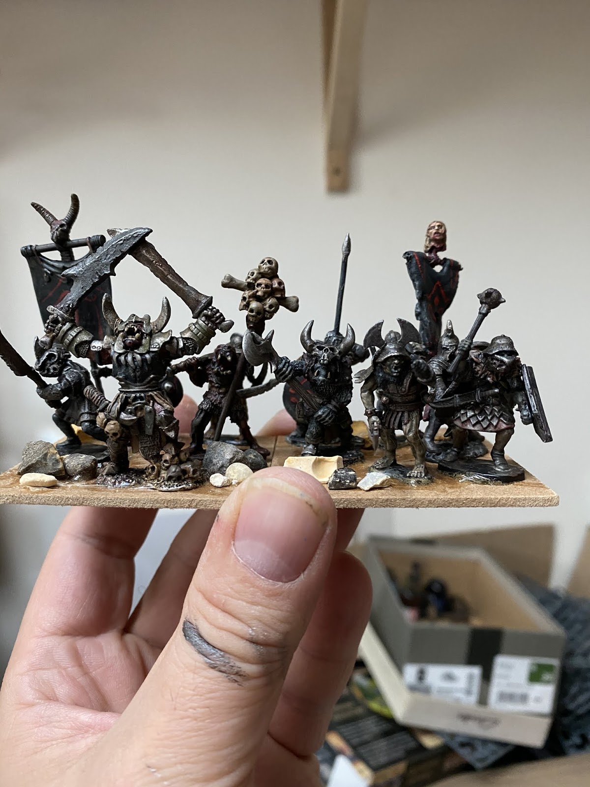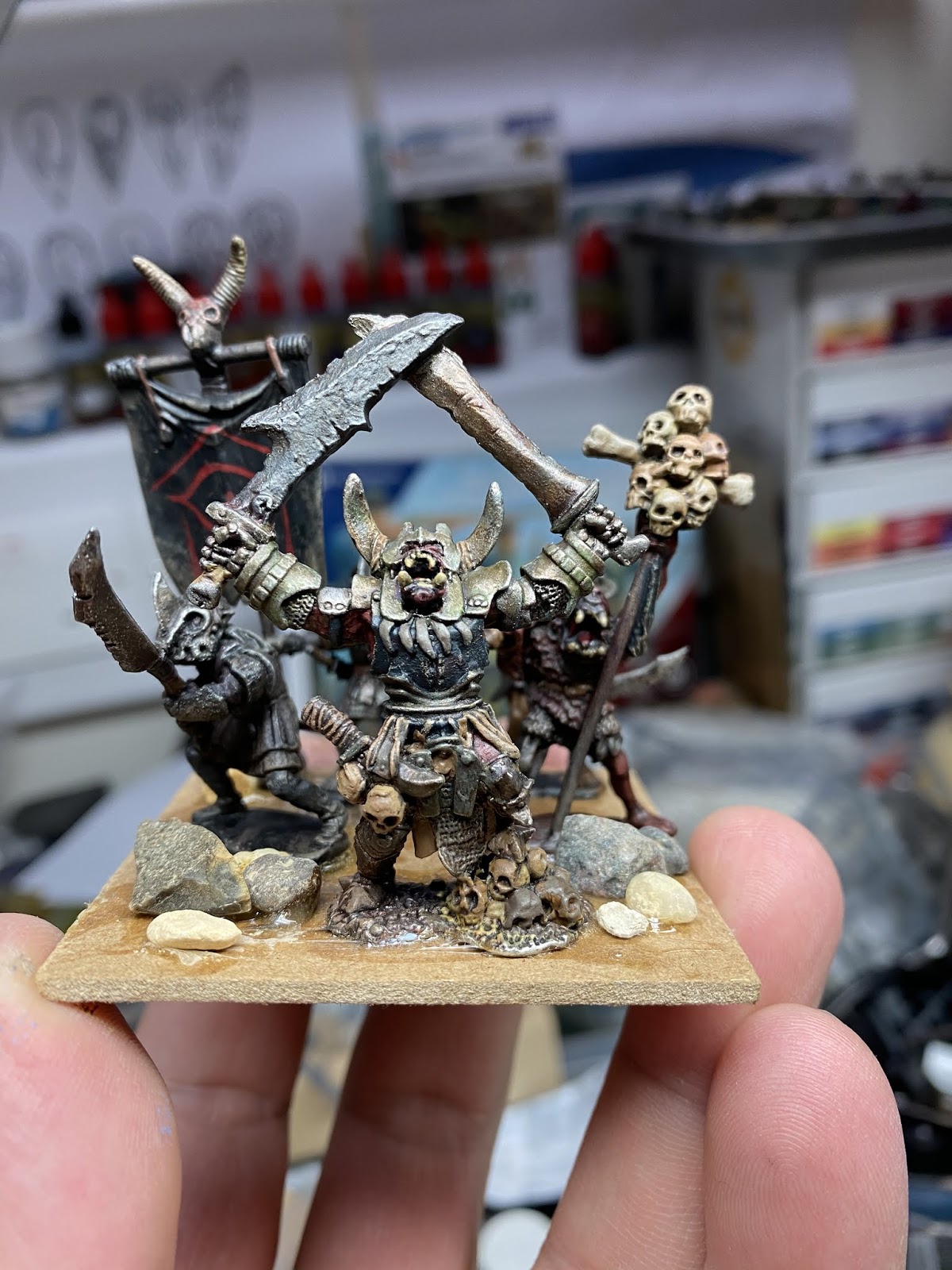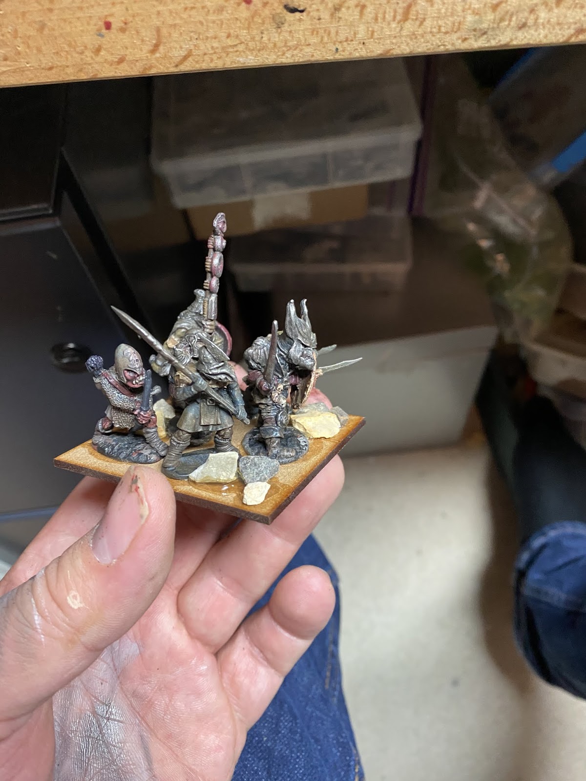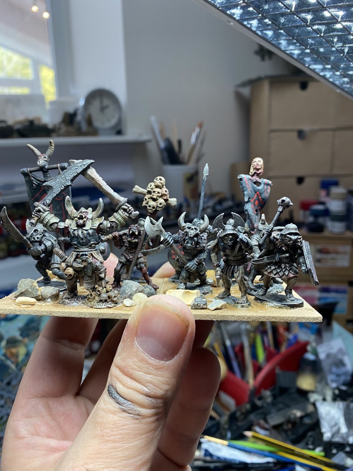 base Orc Command Bases By iron-mitten.blogspot.com Published On :: Sat, 02 May 2020 13:16:00 +0000 I do enjoy painting orcs, it is so enjoyable and freeing after painting hundreds of identical uniforms. These bases had an extra level of enjoyment because they contained many orcy helmets converted with green stuff. I think in the whole they turned okay and add to the hodge podge look of the units. I had planned to spread these helmet guys out but ended up using them all on these two bases, they were finished and ready to go when I needed them, so they were used.This giant orc Warlord is from Reaper Miniatures. He is massive and so he counts as two orcs in one. My six to a base rule works out as if they are small Goblins, they get an extra figure or two. If they are giant warriors, well then they get one less. This is to keep the fighting value of the base the same visually.Plastic Warlord Games orcs with green stuff heads and an old plastic GW banner bring up the rear. Also on this base is the classic standard bearer for Harboth’s Black mountain boys. Classic! No point hanging onto these precious opp models, get them painted and use them I say.It appears my years in Art college weren’t wasted after all. Subconsciously when basing these brutes, I arranged them in such a way that the surrounding orcs weapons help guide your eye on to the leader of the piece. Twenty five years later I finally got it right...Plastic axes were stuck on the leader’s helmet to give him a kind of orcy centurion look. This is influenced by the films I have to say and has a nice brutal look to it.The Elf head on the standard was a nice find, however the pole was really thin and bendy. I reenforced this by adding a green stuff banner which really helped. I tore holes in it and made it look very tattered and the result was very pleasing.The orc above with the mace was made from a Fire forge Sergeant’s body, oathmark goblin arms, warlord games orc head and green stuff mask. He also has a plastic cloak from somewhere too. A real jumble of bits and pieces. I think here lies the real fun of this project, using parts to create unique figures. It’s very rewarding and I have to say becomes very addictive, in fact once you start it’s hard to stop.A new base now and this one is lead by a very old sculpt indeed. I think it is an old ‘Perry’ Chaos warrior. Well, an orc who is a Chaos warrior at any rate. I always try to theme my bases slightly and they are always influenced by the leader. This oop figure needed some old friends to keep him company, so I found some other old Citadel miniatures for the base. Saying that, his two closest warriors are more kit bashed plastics with green stuff helmets. New meets very old.Orcy spears and pole arms can be made by cutting off spears and sticking on naggaity goblin swords. Obviously this works better with plastics and plastic glue. I have found that once the glue has melted the two bits together the weapons are quite durable. The spear shaft will bend rather than the sword break off.Again the arrangement of positions helps to draw your eye into the centre of the piece. I surprise myself with this arty bullsh@t.TIPS.The motley crew. Earth brown paint was stippled over these guys to give them a real dirty look. Lots of brown washes of various shades, green washes, black washes, in fact just go crazy with colour washes, you can’t really go wrong. Once a fine metal dry brush goes over the top, it all looks good and gives the armour a grungy look. Flesh wash is good for rusty armour so put patches of that here and there. If you have any bronze looking armour or shields, try some green wash on that too. Mix washes together to make the grungiest washes. I have a pot labelled ‘magic mix’ where I have mixed black with brown ink, this is great for orc skin, armour, weapons... well everything really. Just slap it on all over. It even smells bad because the tap water used in the mix has gone off, every time you open the orc shading pot... you get the orc!.Give the kit bashing a go, it’s great fun and you will create something unique. Just because you have bought a plastic box set, don’t be scared to mix it up with another of a different make. Single sprues of Dark Age/medieval plastics can be bought on eBay for under a fiver. I use these to try and test things out, if I really like the results I will commit to buying a whole box. Plastics are a lot cheaper than lead so there is room to buy and try out different options without busting the purse strings..Create me an army worthy of Mordor! Full Article Dragon Rampant lord Of The Rings