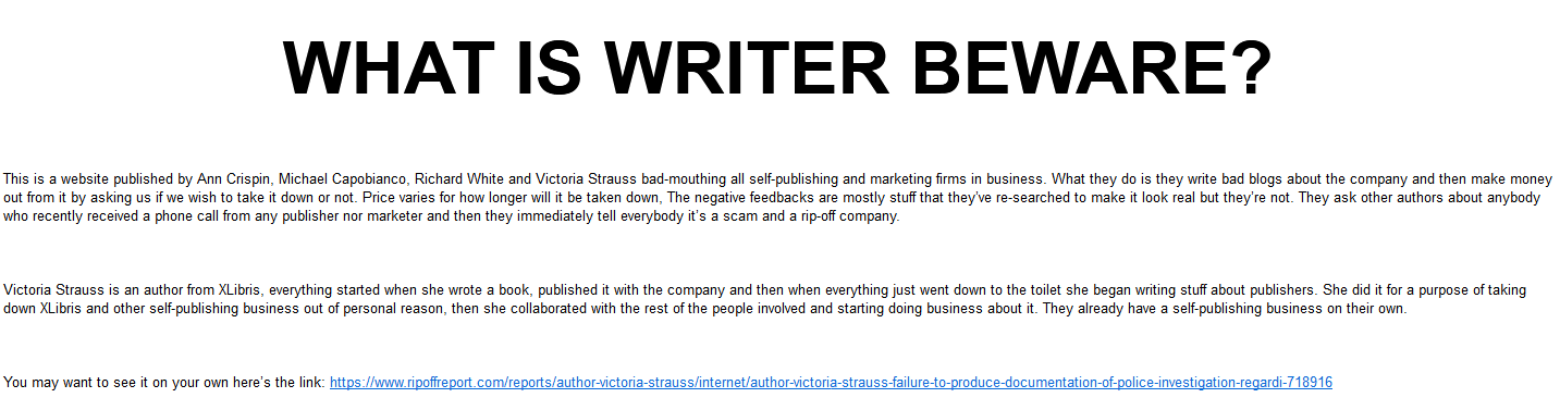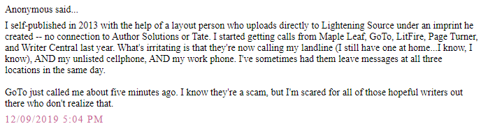 phi From the Philippines, Not With Love: A Plague of Publishing and Marketing Scams By feedproxy.google.com Published On :: Fri, 16 Aug 2019 17:56:00 +0000 Posted by Victoria Strauss for Writer Beware® I've been expending a lot of words and time lately warning about the latest scam phenomenon to hit the writing world: fake publishing and marketing companies that, through outrageous prices and worthless services, extract enormous amounts of money from unwary writers.Based in the Philippines (despite their apparent US addresses, phone numbers, and telemarketer names) and focusing primarily on small press and self-published authors (particularly authors who've published with one of the Author Solutions imprints), these companies recruit writers with relentless--and highly deceptive--phone and email solicitations. Some do provide the services authors pay for, albeit at seriously inflated prices and often of poor quality. Others just take the money and run. I'm hearing from a growing number of writers who've paid five figures in fees to one--or, in some cases, more than one--of these scams, with next to nothing to show for it.Given how fast the scams are proliferating (I learn about a new one every few weeks), I thought it would be helpful to gather all the information I've put together about them in one place.My posts about the scams--where they come from, how they work, and how to recognize them:- Army of Clones: Author Solutions Spawns a Legion of Copycats- Army of Clones Part 2: Twenty-One (More) Publishing and Marketing "Services" to Beware Of- Solicitation Alert: LitFire Publishing- Amelia Publishing and Amelia Book Company: Sons of LitFire Publishing- Solicitation Alert: Book-Art Press Solutions and Window Press Club- Solicitation (and Plagiarism) Alert: Legaia Books / Paperclips MagazineHere's a list of the scams themselves--at least, the nearly 100 I've identified so far (the list is also posted in the sidebar of this blog). You'll note that a number of them operate under more than one name--I suspect the interconnection is much greater than this, but I've only indicated the additional names where I've been able to reliably document them.Some have perished since I began the list--I've noted this, but left their names, for the sake of authors who may have been scammed while they were operational.- Access Media Group (aka Quill Space Media)- Ace Media Creative Publication / Ace Media International / APM Media Production (aka Pearson Media Groups)- ADBooks Media (aka Coffee Press / Okir Publishing, which is defunct)- Alpha Books Solutions- Alpha Books United- Amelia Publishing / Amelia Book Company (aka LitFire Publishing / GoToPublish)- AnalytIQ- Ascribed LLC (defunct)- Author Aide- Author Codex (aka BookSpine Press)- Author Media Express- Author Pro Creatives and Marketing (defunct) (still doing business as Matchstick Literary)- Author Reputation Press- Author University- AuthorCentrix (formerly BookBlastPro)- AuthorLair- Author's Note 360- Authors Press (aka Westwood Books Publishing [formerly Greenberry] / Creative Books)- Beacon Books Agency- Black Lacquer Press & Marketing- BooConn Marketing- Book Agency Plus (aka BookTrail Agency)- Book Art Press Solutions (aka Window Press Club / Booktimes)- Book Avenue Publishing (aka Nivra Press, which is defunct)- Book Magnets- Book Reads Publishing (defunct)- BookSpine Press (aka Author Codex)- Booktimes (aka Book Art Press Solutions / Window Press Club)- BookTrail Agency (aka Book Agency Plus)- Book Vine Press- Books Scribe- BookVenture Publishing- BookWhip (aka Carter Press / PRM Solutions)- Box Office Media Creatives (aka Buzz Media Creatives)- Bright Lights Distribution- Buzz Media Creatives (aka Box Office Media Creatives)- Capstone Media Services (defunct) (now doing business as Stampa / Stampa Global)- Carter Press (aka BookWhip / PRM Solutions)- Chapters Media & Advertising (aka Techbooks Media)- Coffee Press (aka ADBooks Media) (formerly Okir Publishing)- Creative Books (aka Westwood Books Publishing / Authors Press)- Creative Titles Media (aka TrueMedia Creatives)- Crest Media Distribution- Diamond Media Press- Dream Books Distribution- EC Publishing- Editor's Creative Media (aka Editor's Press and Media)- Editor's Press and Media (aka Editor's Creative Media)- Global Summit House- Gold Touch Press- Golden Ink Media Services- Goldman Agency- GoToPublish (aka LitFire Publishing / Amelia Publishing / Amelia Book Company)- Happy Media Consulting- Haynes Media Group- IdeoPage Press Solutions (aka The Writer Central)- Legaia Books- Lettra Press- LitFire Publishing (aka Amelia Publishing / Amelia Book Company / GoToPublish)- Maple Leaf Publishing- MatchStick Literary (aka Author Pro Creatives and Marketing --defunct)- McNaughton Books / McNaughton Publishing (website is currently dead)- Netsfilm & Media Press- New Leaf Media- New Reader Media- Nivra Press (defunct) (still doing business as Book Avenue Publishing)- Okir Publishing (defunct) (still doing business as ADbook Press / Coffee Press)- Outstrip (defunct)- PRM Solutions LLC (aka Carter Press / Bookwhip)- Pacific Books- PageClapp Media- PageTurner, Press and Media- Parchment Global Publishing- Paradigm Print- Paramount Books Media- Pearson Media Groups (aka Ace Media Creative Publication / Ace Media International)- Press To Impress Publishing- Pubkits.com- Quill Space Media (aka Access Media Group)- Readers Magnet- Royale House (defunct)- Rushmore Press- Sherlock Press (defunct)- Silver Fox Media- Stampa / Stampa Global (formerly Capstone Media Services)- Stonewall Press (aka Uirtus Solutions) (both defunct)- Stratton Press- Techbooks Media (aka Chapters Media & Advertising)- Toplink Publishing- TrueMedia Creatives (aka Creative Titles Media)- Uirtus Solutions (aka Stonewall Press) (both defunct)- Universal Book Solutions- URLink Print and Media- Vivlio (a.k.a. Vivlio Hill, Vivlio Hill Publishing, Vivlio Solutions, Vivlio Marketing Solutions)- WestPoint Print and Media- Westwood B