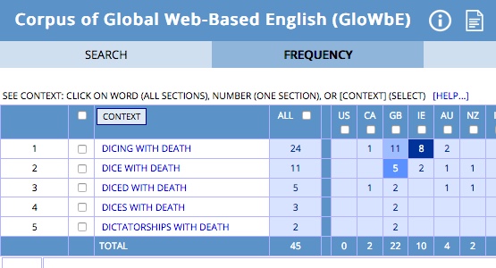 dea dicing with death By separatedbyacommonlanguage.blogspot.com Published On :: Fri, 14 Feb 2020 17:31:00 +0000 Previously on this blog, I've discussed whether BrE and AmE are different in their singular for dice. Have a look at that blog post if that's what you're interested in.This one is about the phrase to dice with death, meaning essentially, to take risks with one's life or safety. It's one of those things that I didn't reali{s/z}e was BrE until another American pointed it out to me. (Apologies if you were that uncredited American—I can no longer find the correspondence.)The OED says the use of dice to mean 'risk' is especially associated with motor sports (a phrase that itself seems to be more BrE than AmE). It is not about chopping up death into cubes, but about 'gambling with one's life' (a phrasing that can be used in either language). Though Merriam-Webster includes this use of dice with an example from Newsweek, it's nowhere to be seen in the American portion of the GloWBE corpus.The phrase raised two questions for me:is it dicing with death or dicing with Death?I imagined the latter, that it's playing a game of dice with the Grim Reaper. But none of the corpus examples treat death as a proper name, so perhaps I'm alone in that.what's the relationship to dancing with death? Since not a lot of people use dice as an intransitive verb to mean 'to play dice', I was imagining that dance with death might have arisen from a misunderstanding of dice with death—an eggcorn, if you will. And I think there's some evidence to back that up:In this Google Books Ngram chart (click on it for details), the blue line shows dicing with death is already in existence in BrE during (BrE) the War. The green line is American use of it, intermingling early on with dancing with death. Dancing with death eventually catches up with dicing in AmE, while also rising in BrE, perhaps getting more currency as people have more distance from the 'risk' use of dice as a verb.For what it's worth, it's slightly easier to find capital-D Death with dance than with dice, but it's far more common to find it lower-case. Full Article death idioms